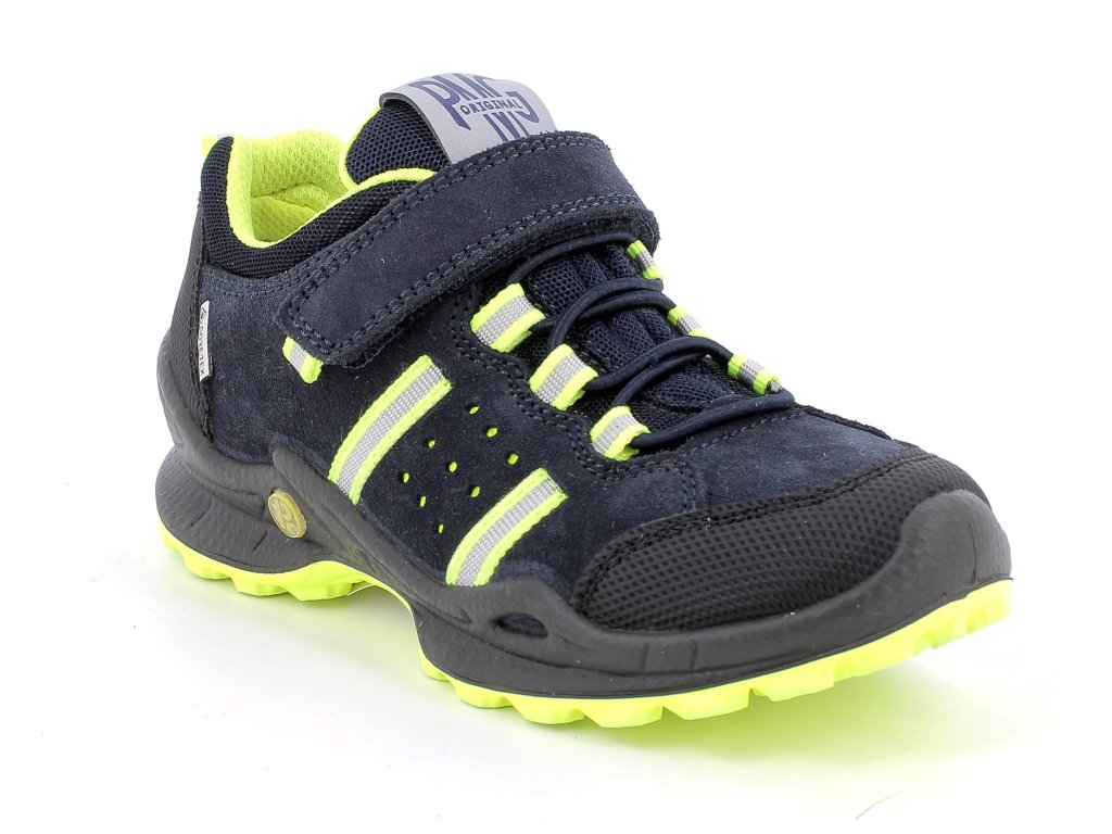Outdoorové chlapčenské topánky Primigi 1378900 . Brúsená tmavo modrá koža s kontrastnými svietivo žltými detailmi a gumovými ochrannými prvkami na špičke a päte. Odolná a ľahká podrážka s hrubou vzorkou . GoreTex membrána zaistí nepremokavosť a zároveň priedušnosť, takže udrží detské nôžky v suchu a pohodlí.