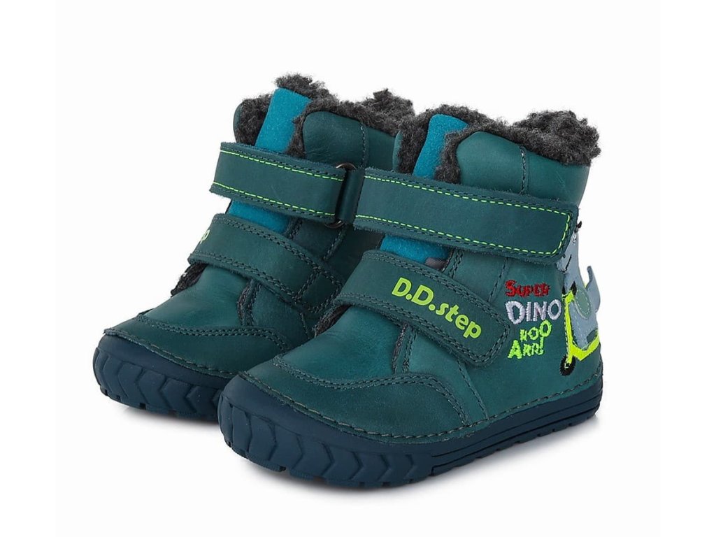 Detské zimné topánky DDstep W029-394B Bermuda Blue vyššieho strihu, siahajú niekoľko cm nad členky. Hrejivý kožúšok vo vnútri celej topánky zaistí teplo v zimnom období. Vyberateľná penová stielka s nášľapom z kožúšku. Podrážka je mäkká, ohybná av prednej časti je vyvýšená - chráni tak topánky proti okopu. Opätok je spevnený, drží nôžky v osi a zabraňuje tak vtáčaniu členkov dovnútra. Topánky majú dva suché zipsy, pomocou ktorých sa dajú krásne regulovať v oblasti priehlavku aj členku. V modrozelenej farbe s veselým motívom dinosaura.