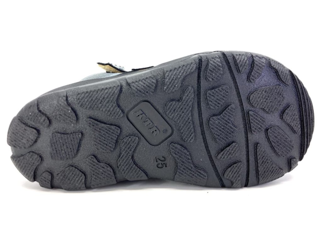 Detské zimné topánky KTR 315 Sova čierna/jeans zateplené pravou ovčou vlnou. Topánky sú vyššieho strihu - končia cca 3cm nad členkom a sú vybavené membránou Te-Por, vďaka ktorej sú nepremokavé a priedušné zároveň. V prednej časti topánky je veselý motív z brúsenej kože, na ktorej nie sú toľko viditeľné stopy po prípadnom zakopnutí. Topánky sú v prednej časti širšie a majú dostatok priestoru na prsty. Podrážka má hrubšiu vzorku a je dobre ohybná.