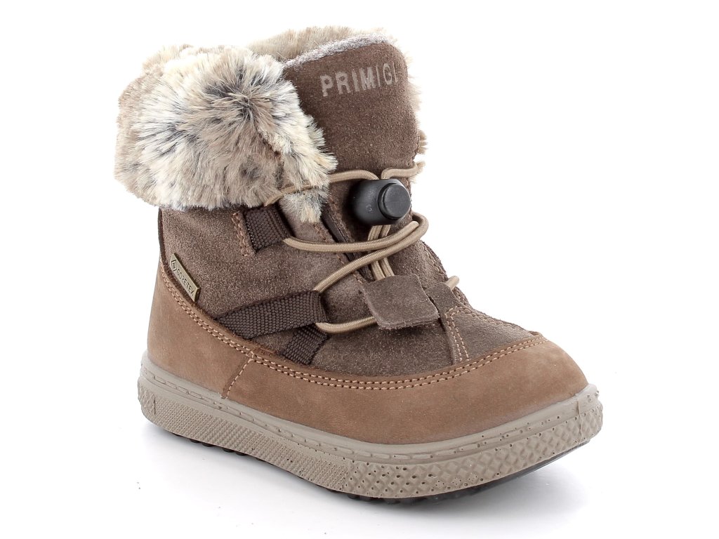 Štýlové a praktické zimné topánky Primigi s Gore-Tex 8856411 . Elegantná hnedá brúsená koža s praktickým zapínaním na suchý zips. Topánky sú skôr nižšie - končia cca 5 cm nad členkom, vďaka tomu sa v nich chodia lepšie, než vo vysokých snehuliach. Okolo členka majú teplý kožúšok, ktorý je príjemný na omak.