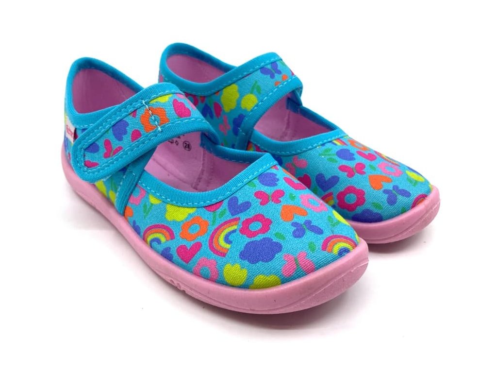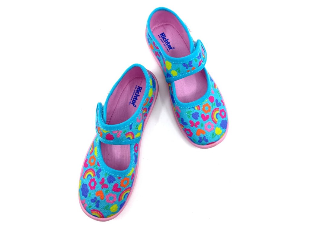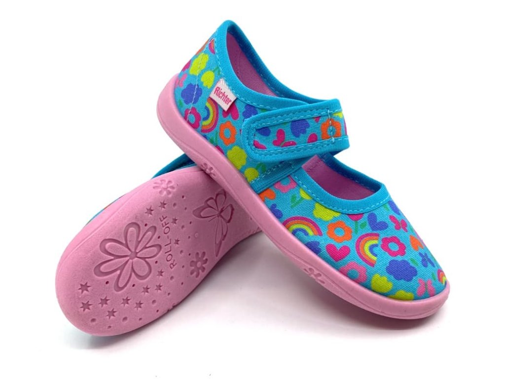 Dievčenské papuče Richter 9150-3292 Baumwolle Jelly s motívom kvietkov, sadnú na užšie nôžky a zapínaním na suchý zips sa dajú krásne regulovať v oblasti priehlavku. Sú teda vhodné aj pre vyšší priehlavok.