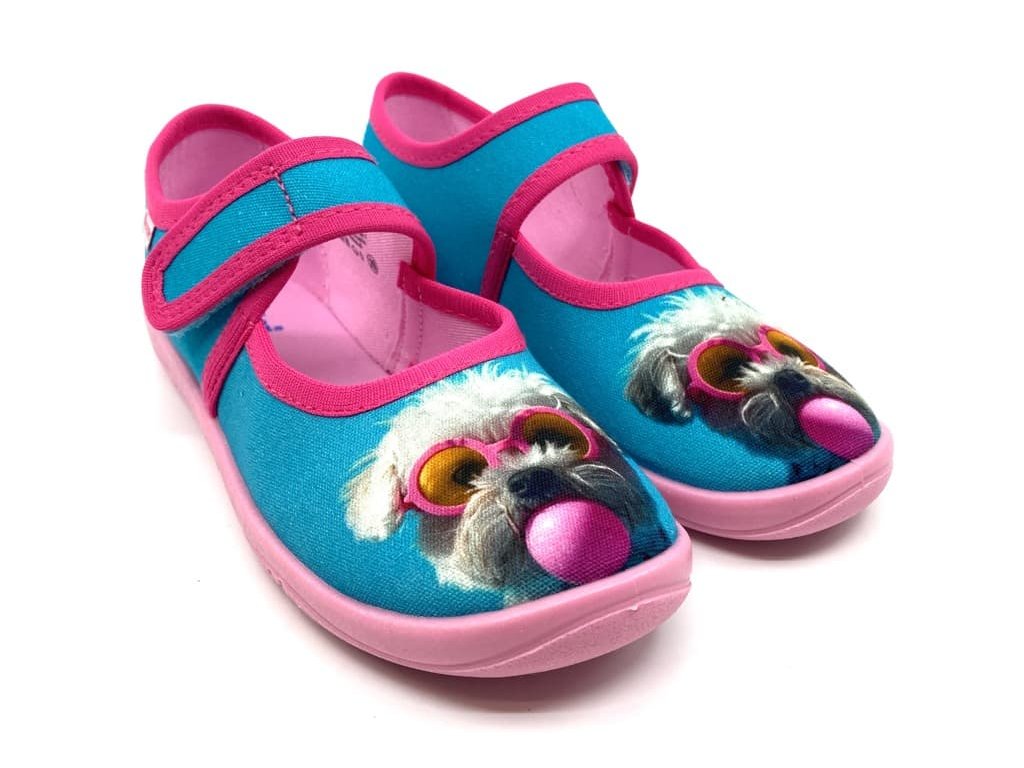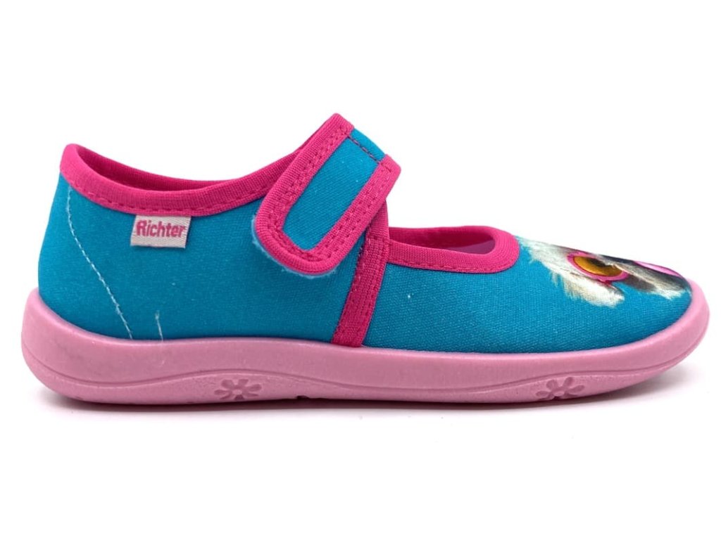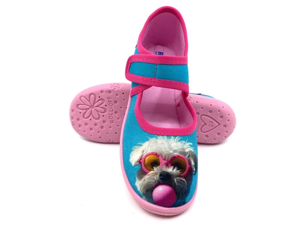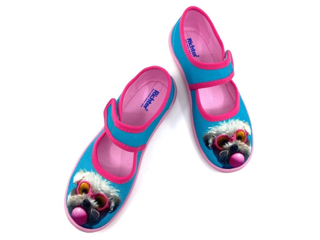 Dievčenské papuče Richter 9150-3292 Baumwolle Dig Dog s motívom psíka, sadnú na užšie nôžky a zapínaním na suchý zips sa dajú krásne regulovať v oblasti priehlavku. Sú teda vhodné aj pre vyšší priehlavok.
