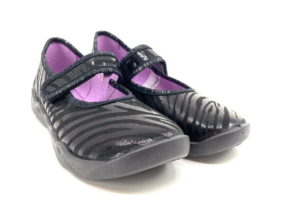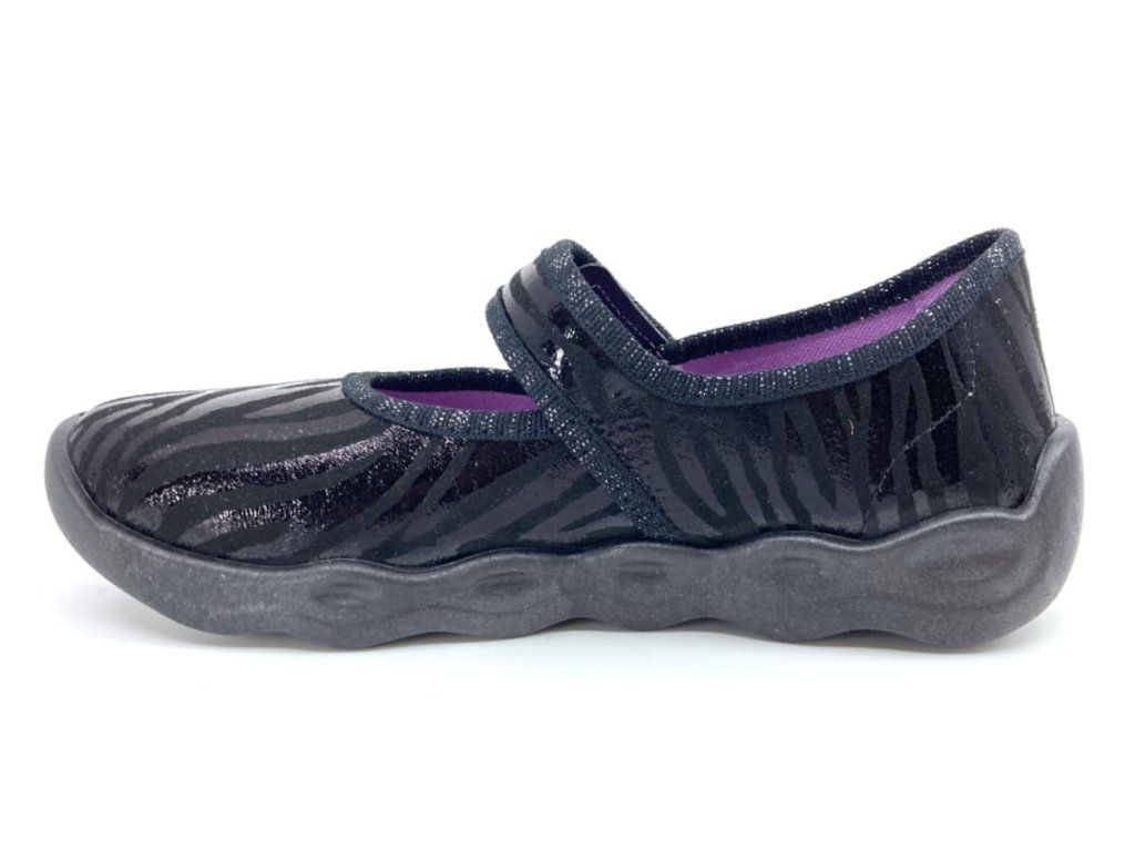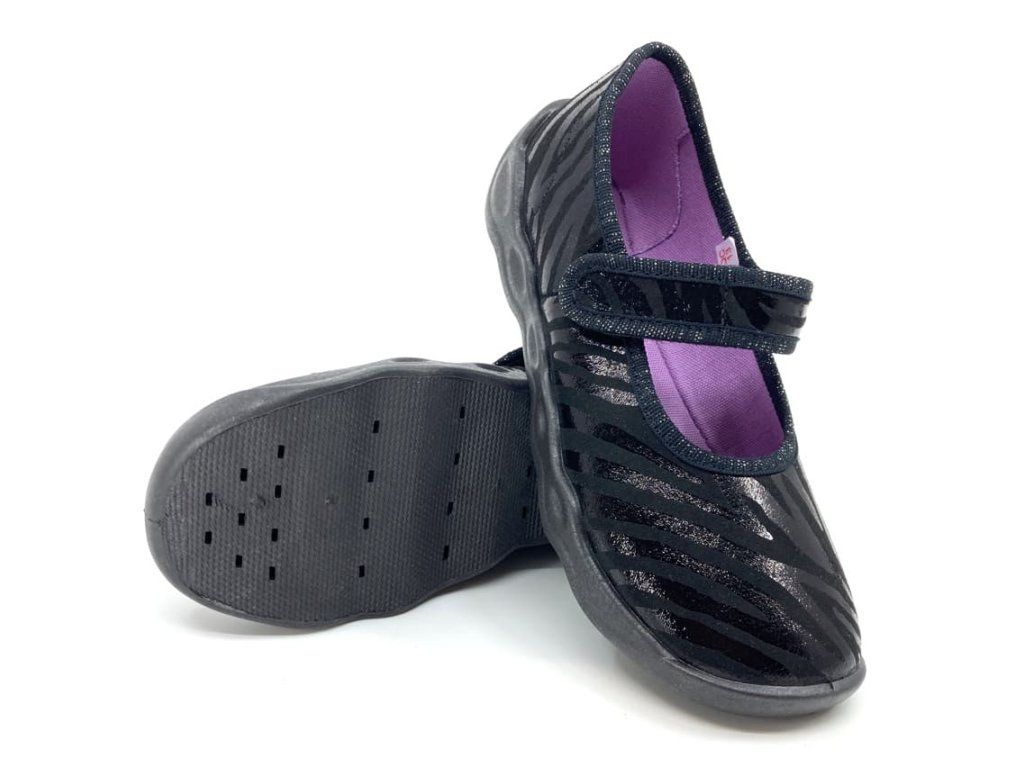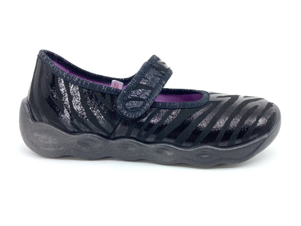 Dievčenské papuče Superfit Bubble 1-006271-0050 v čiernej farbe s lesklým motívom. So zapínaním na suchý zips , vďaka ktorému sa dajú krásne regulovať v oblasti priehlavku. Sú vhodné aj pre vyšší priehlavok. V okolí členku je mierne vykrojenie a tým topánka lepšie padne. Dá sa povedať, že členok úplne kopíruje a tým sa papuče naozaj pohodlne nosia. Využiteľné aj ako balerínky.