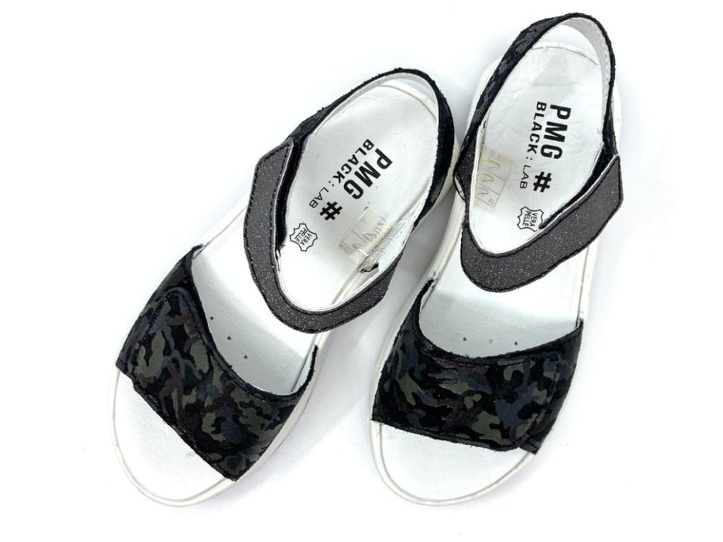 Dievčenské sandále Primigi 3890222 s otvorenou špičkou a pätou do teplých letných dní. Vzor čierneho maskáča oživený trblietajúcim sa pásikom cez priehlavok. Príjemná kožená podšívka vrátane mäkkej stielky. Módna, mohutnejšia podrážka.
