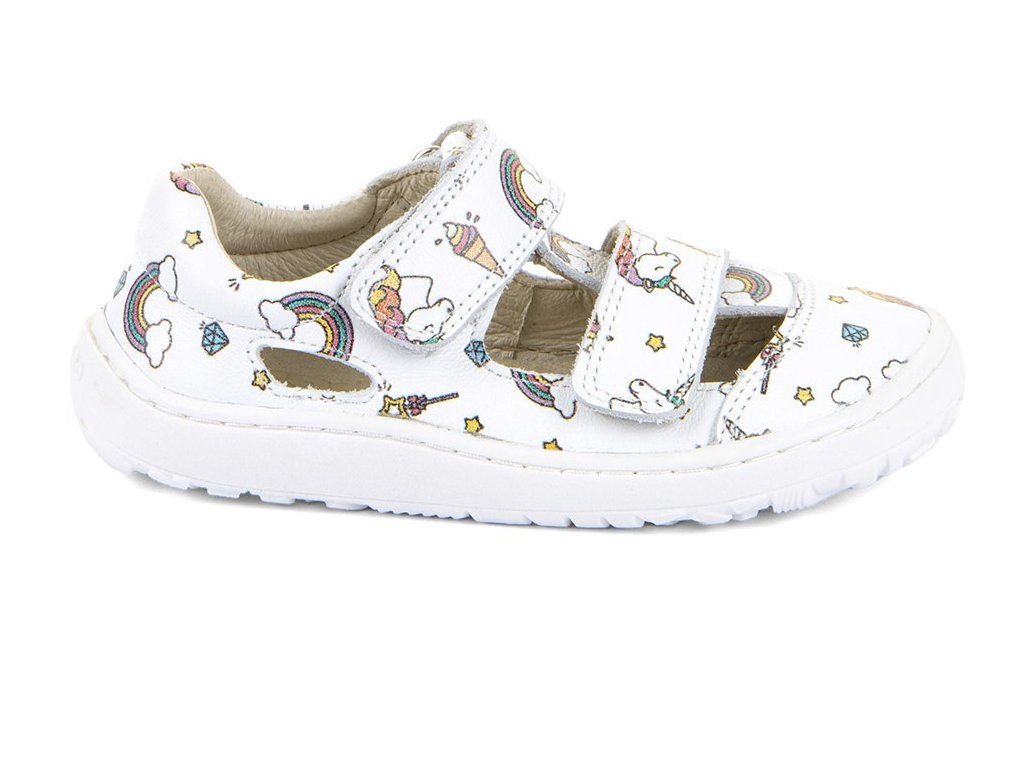 Štýlové kožené barefoot sandále Froddo G3150291-13 White+ so zapínaním na suchý zips pre ľahké obúvanie. V dievčenskej bielej farbe s motívom jednorožcov. Topánky majú flexibilnú podrážku z prírodnej gumy s jemnou vzorkou.