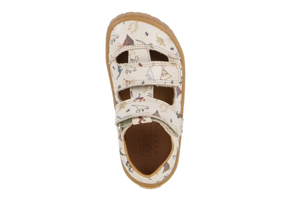 Štýlové kožené barefoot sandále Froddo G3150291-16 Beige so zapínaním na suchý zips pre ľahké obúvanie. V unisex béžovej farbe s motívom dinosaurov. Topánky majú flexibilnú podrážku z prírodnej gumy s jemnou vzorkou.