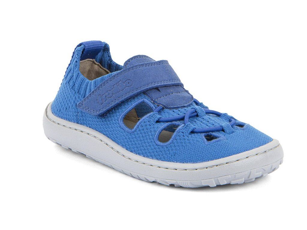 Štýlové textilné barefoot sandále Froddo G3150296-1 so zapínaním na suchý zips pre ľahké obúvanie. V spodnej časti je gumička, ktorá ale nemožno nijako utiahnuť. V chlapčenskej modrej farbe. Topánky majú flexibilnú podrážku z prírodnej gumy s jemnou vzorkou.