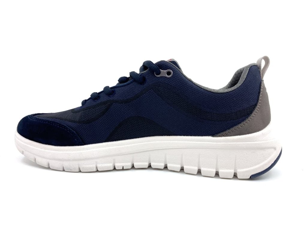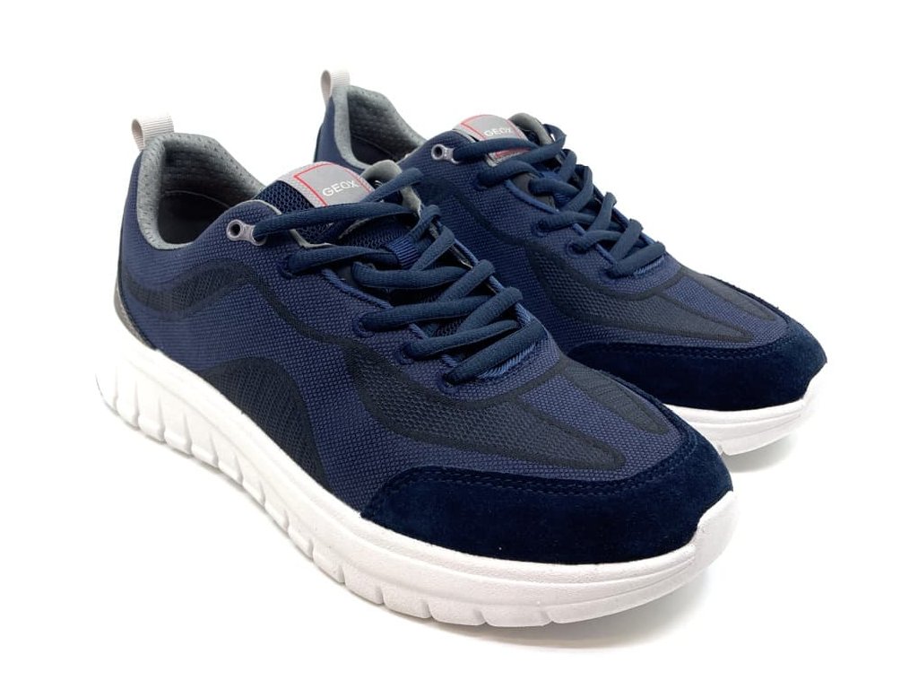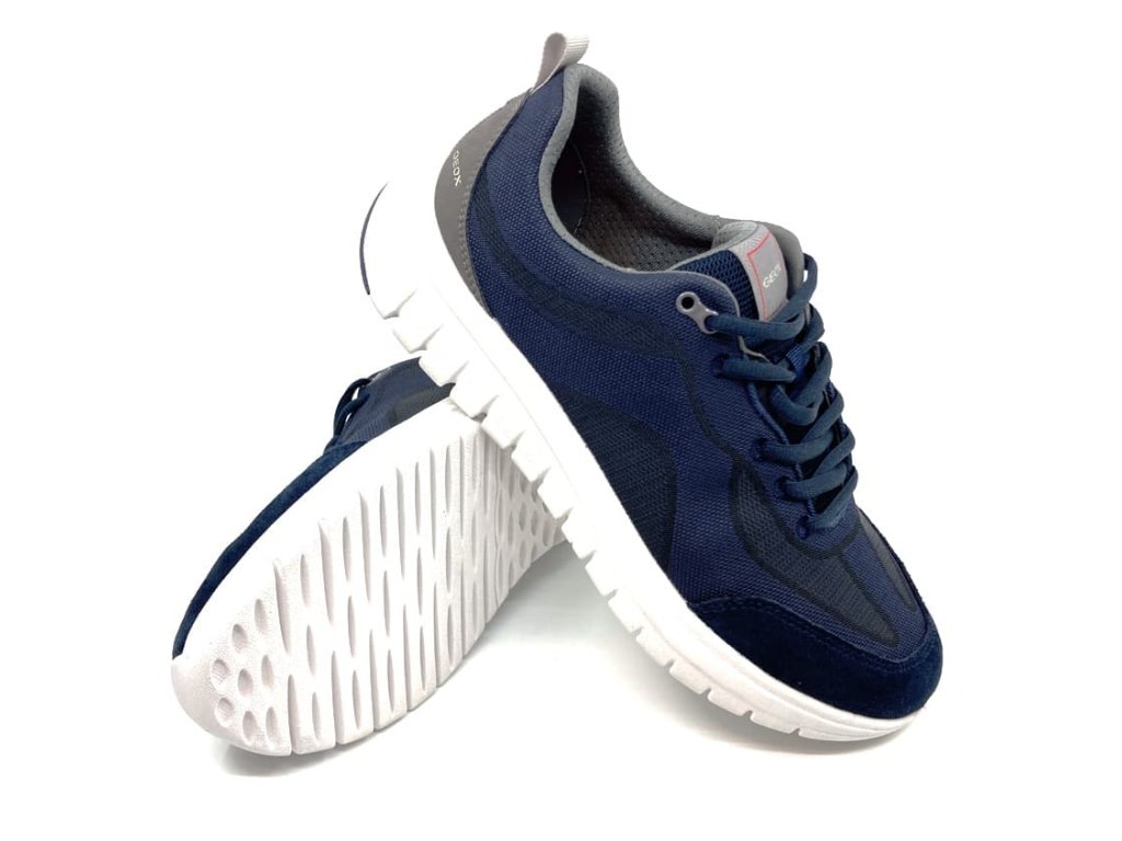 Pánske tenisky Geox Flextride Navy v modrej farbe s bielou podrážkou . Moderný športovo elegantný vzhľad tenisiek. Kombinácia brúsenej kože a priedušného textilu. Respira podrážka odvádza pot a pritom je vďaka membráne nepremokavá.