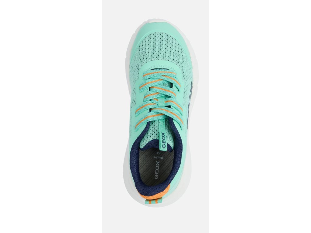 Športové tenisky Geox Flexyper Fast vo svetlo zelenej - Mintovej farbe Mint / Orange . Sú ideálnou voľbou pre aktívne deti na bežné nosenie . Zaujmú svojim moderným dizajnom aj ľahkosťou . Navyše sú perfektne priedušné vďaka zvršku z textílie a technológii Respira™ , ktorá zaisťuje ideálnu priedušnosť pomocou špeciálnej membrány v podrážke. Tá odvádza vlhkosť a zabraňuje prenikaniu vody dovnútra.