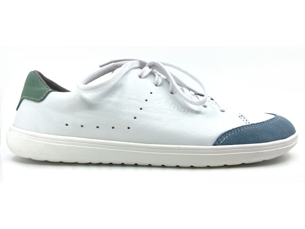 Kožené barefoot Jonap šedomodrá v kombinácii bielo šedo a zelenej farby. Tieto barefoot tenisky sú na novej, odolnej podrážke z pravej gumy (2024), ktorá je mäkká a výborne ohybná všetkými smermi.