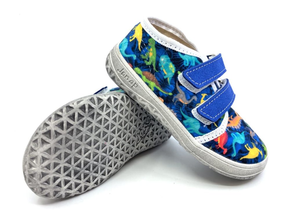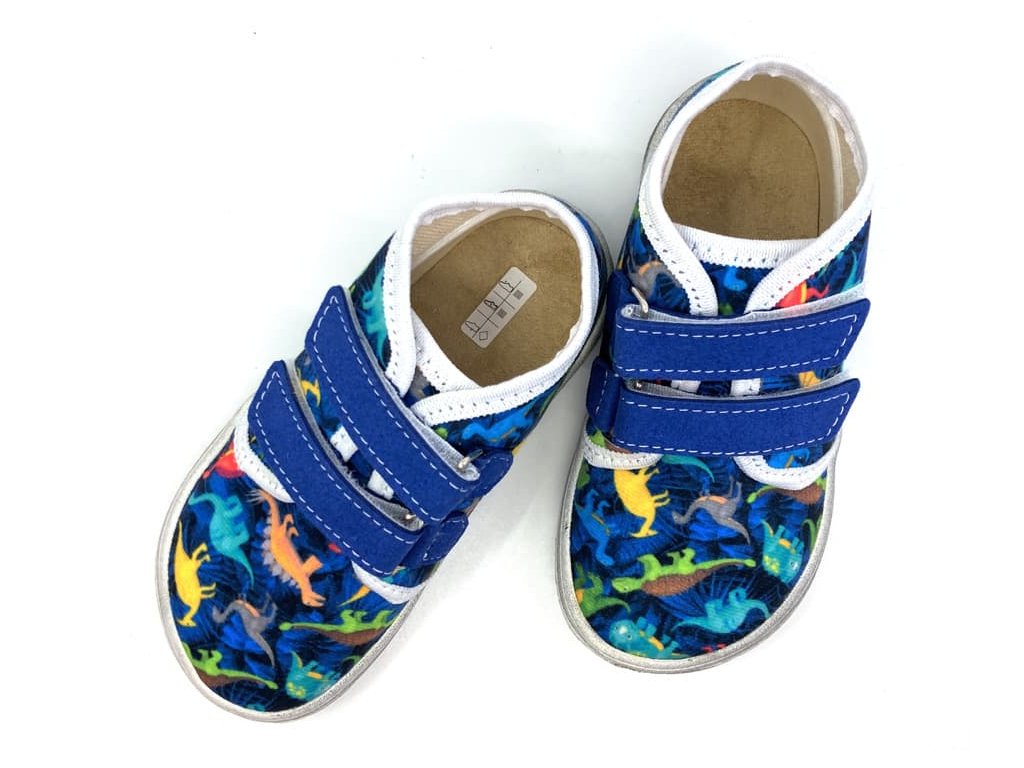 Textilné barefoot tenisky Jonap B17 modré s dinosaurami sú vhodné do teplých dní na jar a leto. Topánky končia v úrovni členkov, sú z jednej vrstvy textilu a tým pádom sú dobre priedušné. Stielka je z 2mm peny s vrchnou vrstvou z príjemného mikrovlákna. Rovnako sú z umelého mikrovlákna aj suché zipsy.