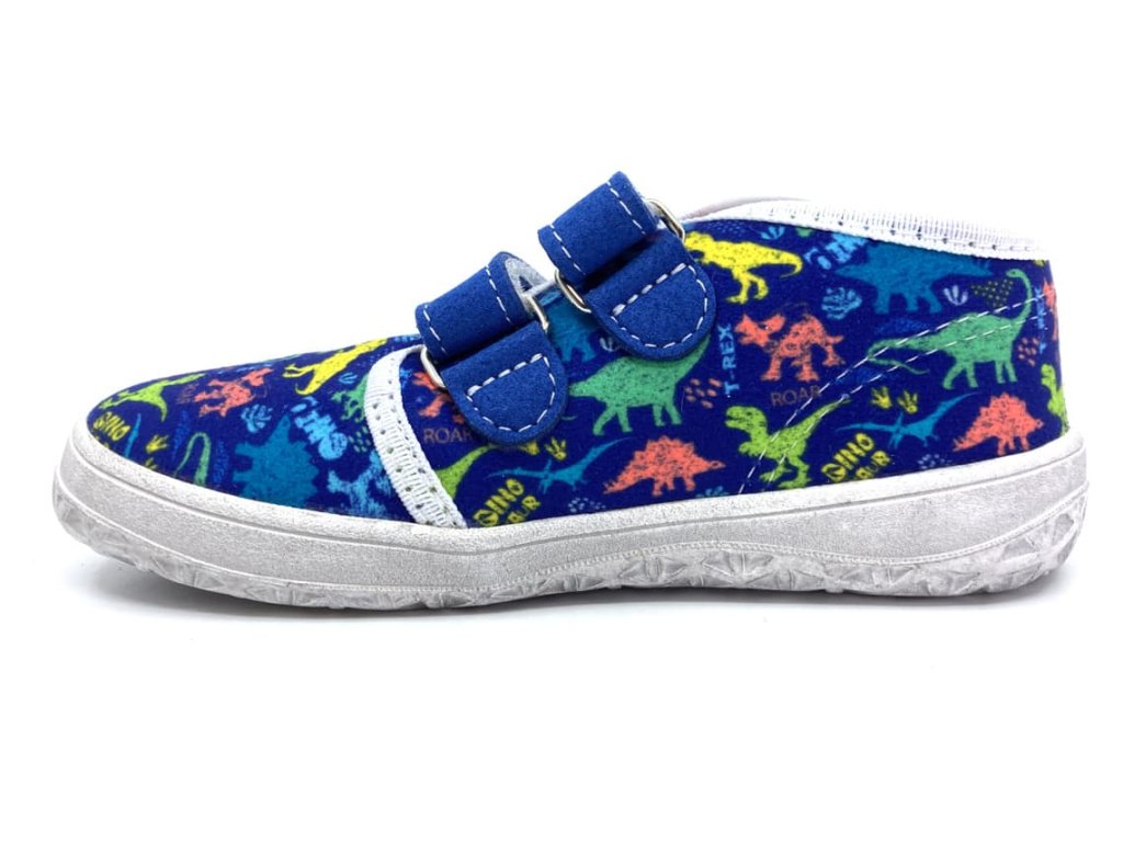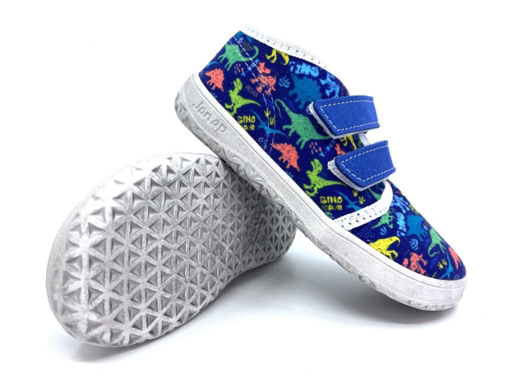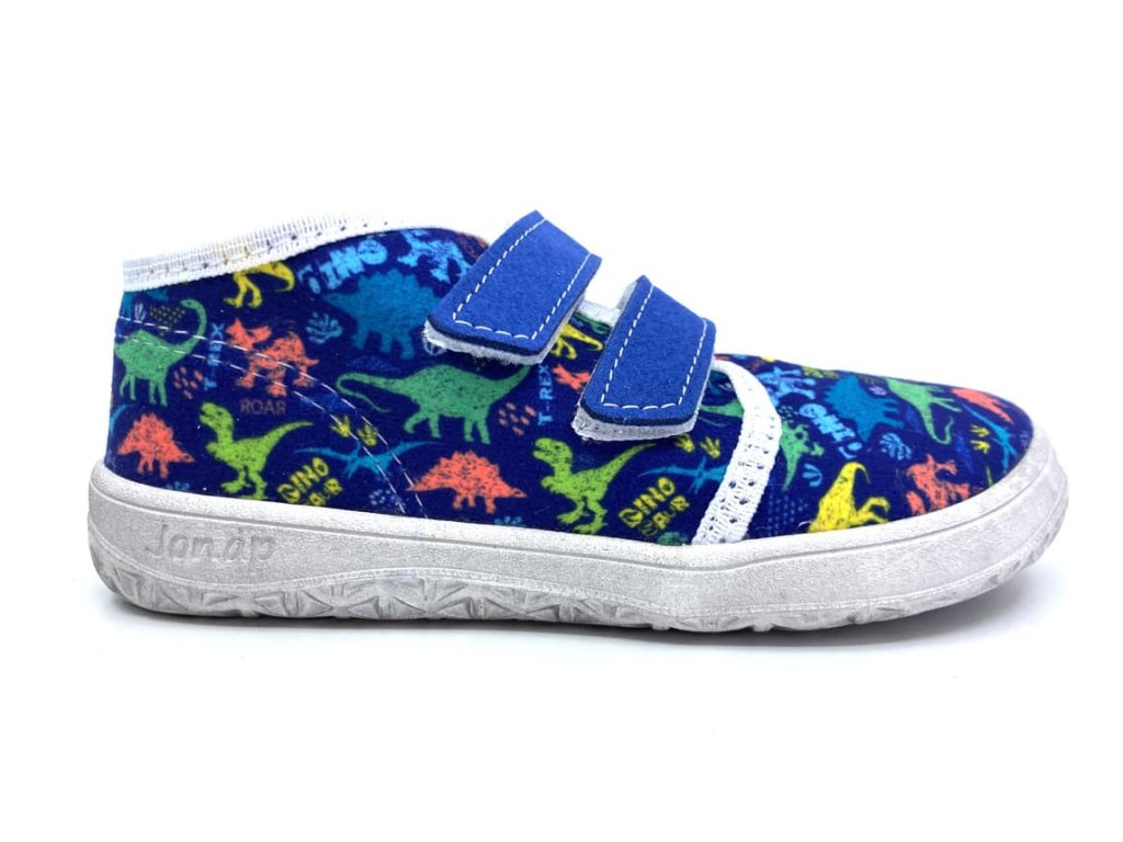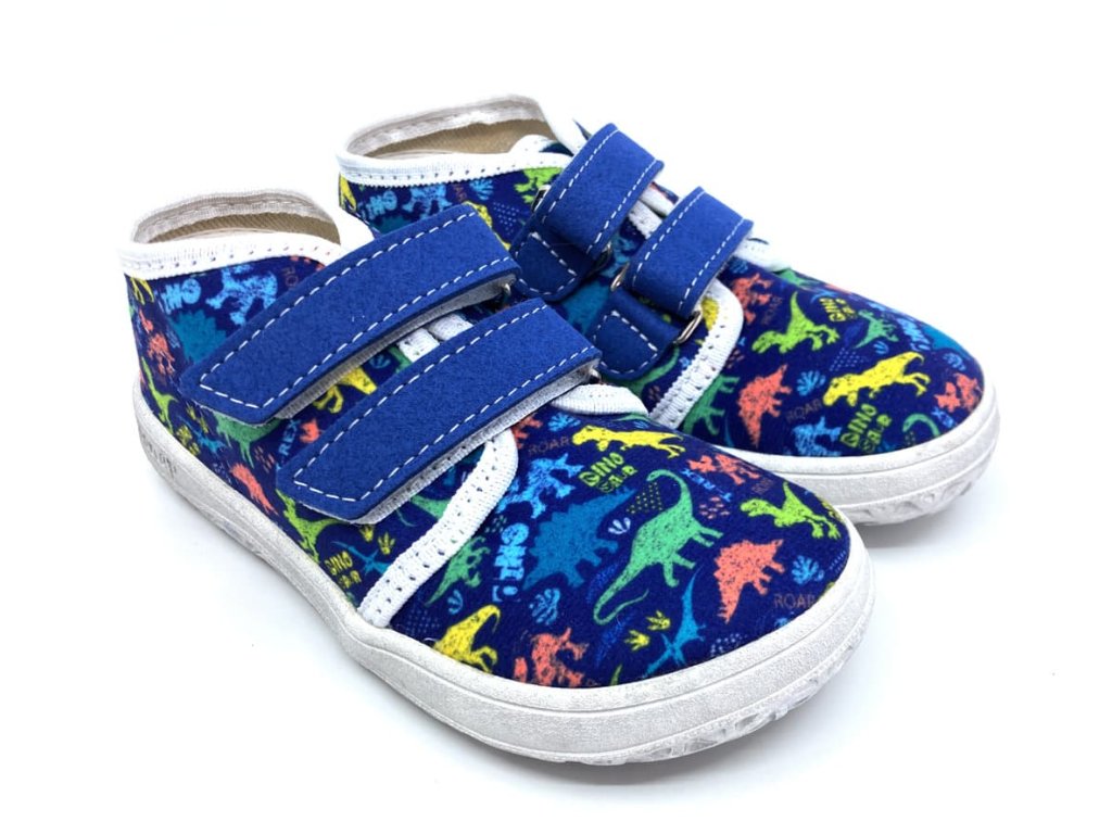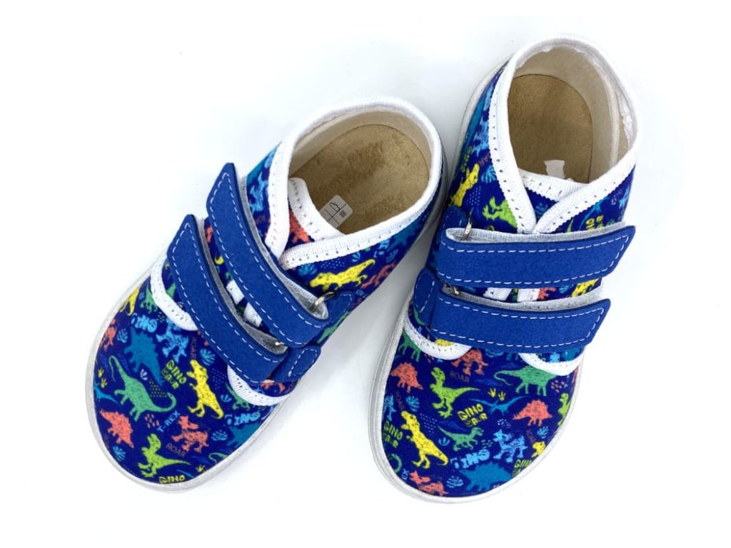 Textilné barefoot tenisky Jonap B17 modré s dinosaurami sú vhodné do teplých dní na jar a leto. Topánky končia v úrovni členkov, sú z jednej vrstvy textilu a tým pádom sú dobre priedušné. Stielka je z 2mm peny s vrchnou vrstvou z príjemného mikrovlákna. Rovnako sú z umelého mikrovlákna aj suché zipsy.