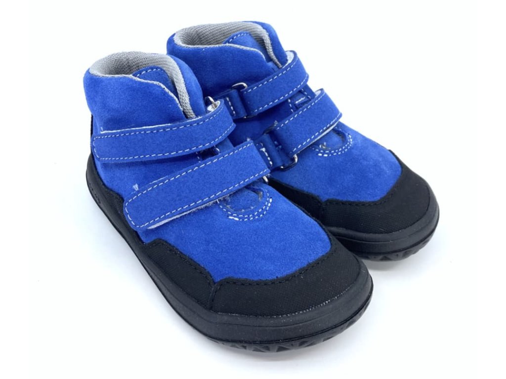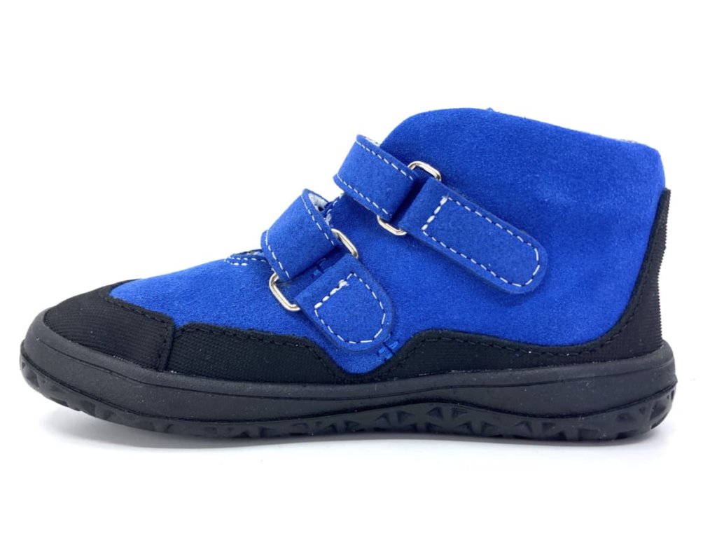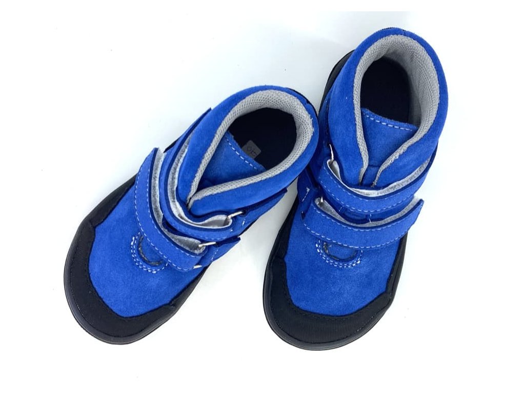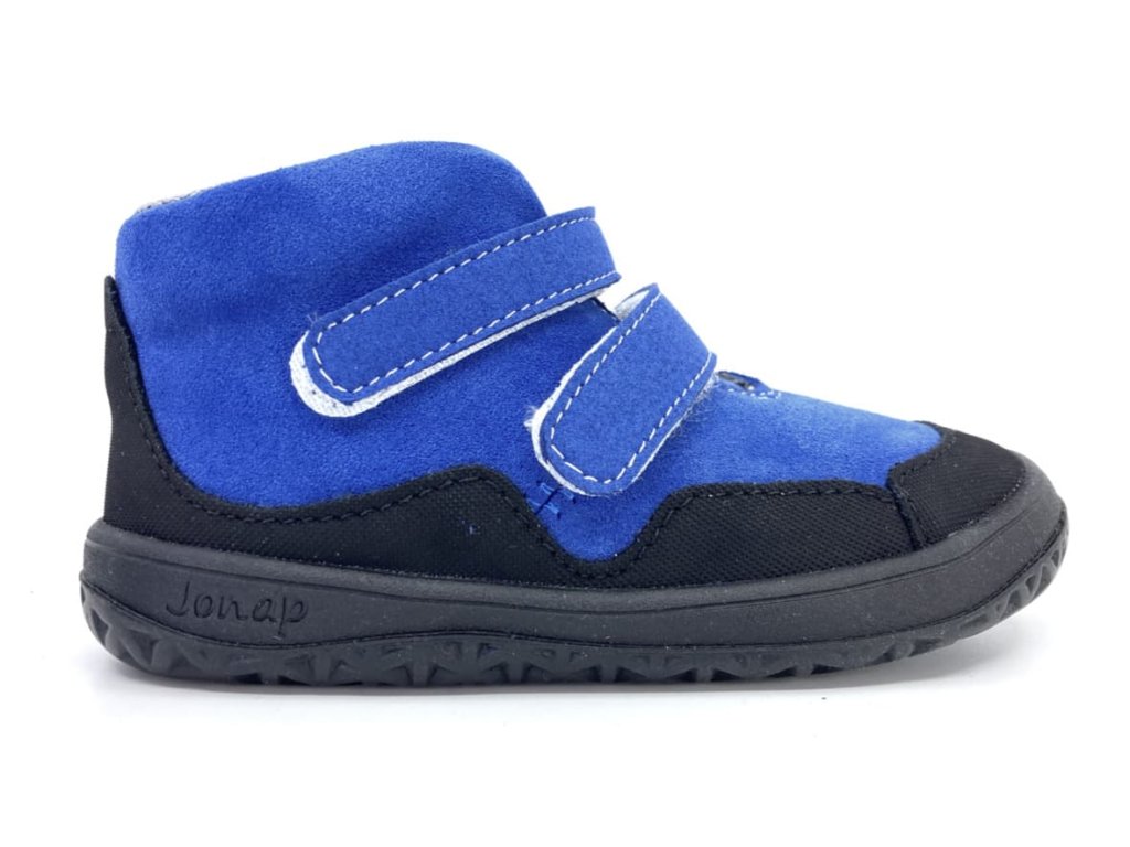 Detské celoročné kožené barefoot topánky Jonap Bella v zúženej verzii SLIM v modrej farbe. Topánky sú vyššieho strihu, končia tesne nad členkom. Zvršok je z brúsenej kože, vnútro textilné a príjemne mäkké. Opätok je spevnený. Okolo celej topánky je praktický kožený okop s jemnou vzorkou - topánky tak dlhšie vydržia ako nové, okop zároveň zvyšuje odolnosť proti premoknutiu napr. v mokrej tráve.