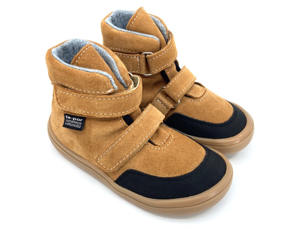 Detské celoročné kožené barefoot topánky Jonap Jerry v škoricovej farbe . Topánky sú vyššieho strihu, končia tesne nad členkom. Vonkajšia vrstva je z velúrovej kože, vnútorná podšívka je príjemná a zároveň teplejšia - do jesenného počasia idálna. Navyše vďaka membráne Te-por sú topánky nepremokavé a zároveň priedušné . Opätok je spevnený výstuhou. Prednú časť lemuje je praktický kožený okop s jemným vzorom - topánky tak dlhšie vydržia ako nové.