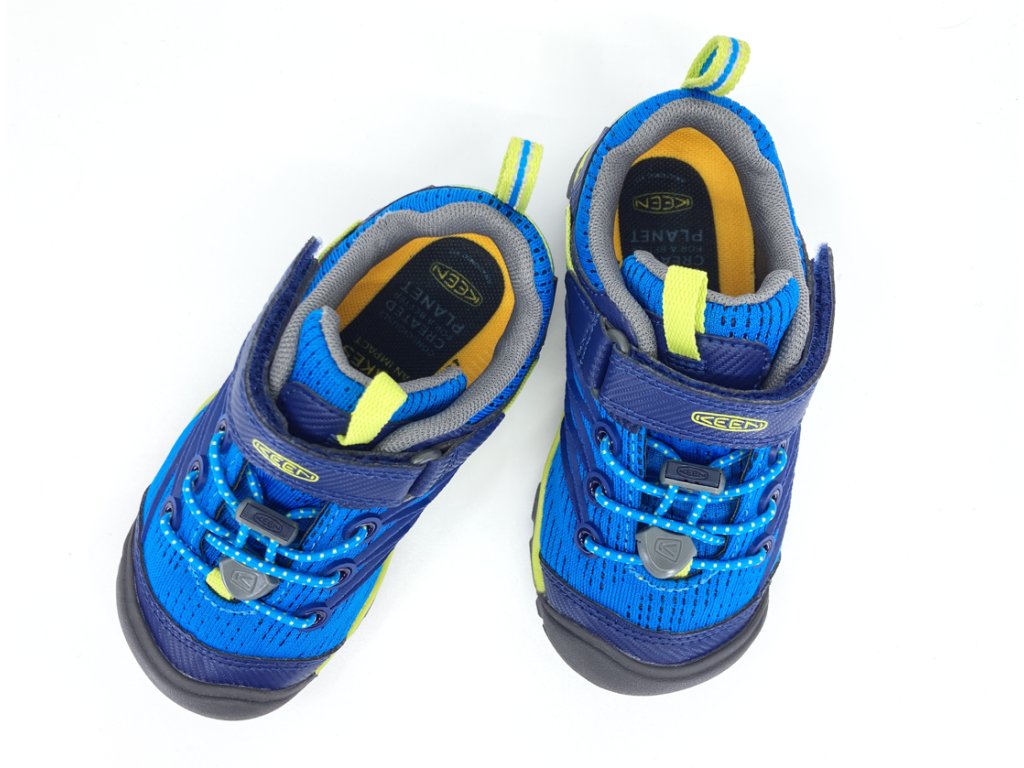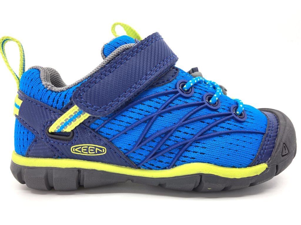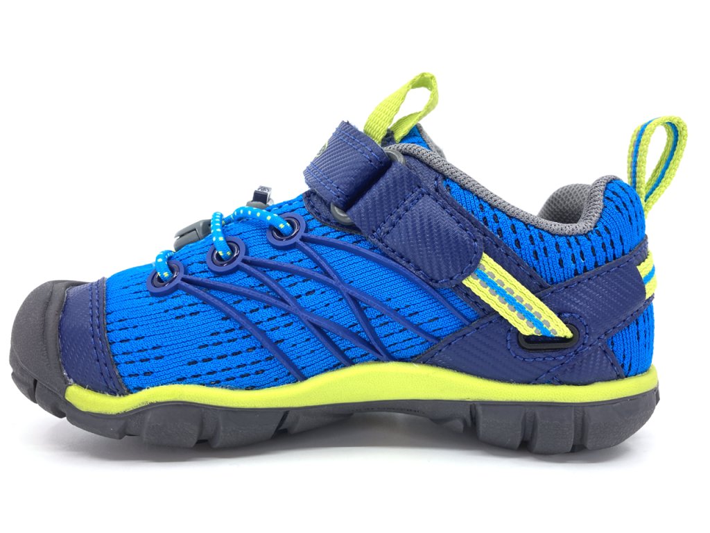 Odolné detské tenisky Keen Chandler CNX v chlapčenskej kombinácii Brilliant Blue / Blue Depths - odtiene modrej farby so zelenými detailmi. Výrazná gumová ochrana špičky, typická pre značku Keen. Polstrovanie okolo členku zabraňuje nechcenému vyzúvaniu topánky. Vrchná textilná časť je pomerne ľahká a priedušná.