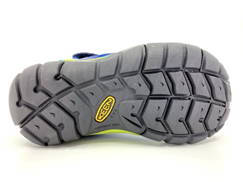 Podrážka: v prednej časti dobre ohybná - dieťa teda môže prirodzene chodiť, vpredu výrazná ochrana špičky, typická pre značku Keen, podrážka má vzorku pre pohyb v prírode