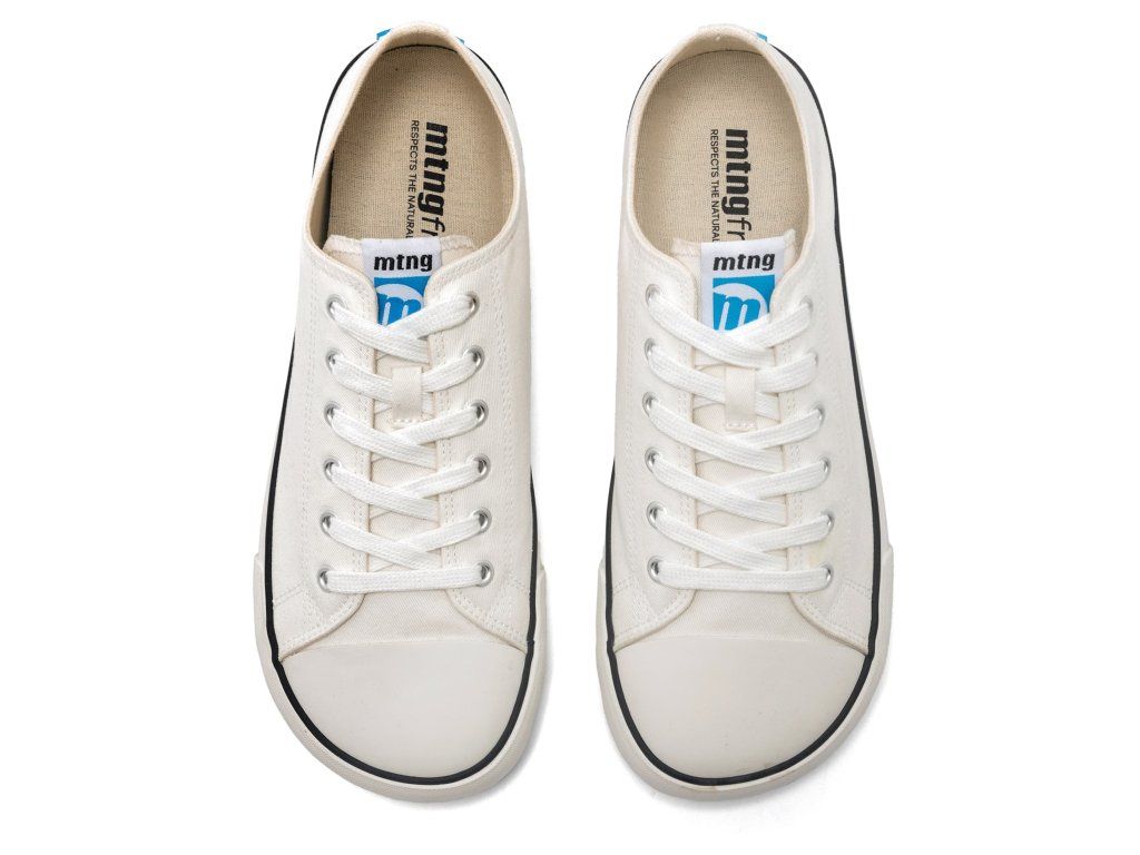 Pánske barefoot tenisky MTNG Canver White majú čistý a nadčasový dizajn v štýle Converse - biely zvršok v kombinácii s čiernymi detailmi na podrážke, klasické biele šnúrky a ľahká flexibilná podrážka.