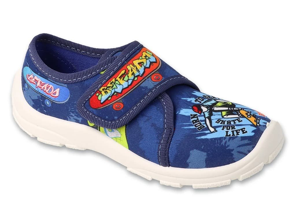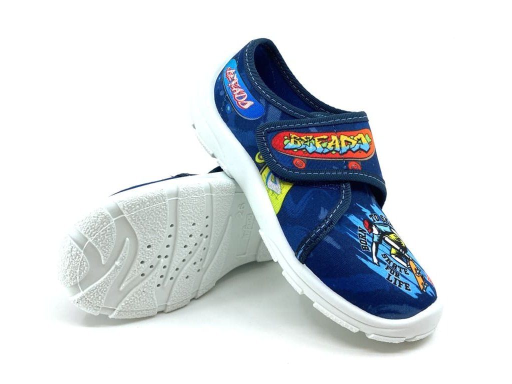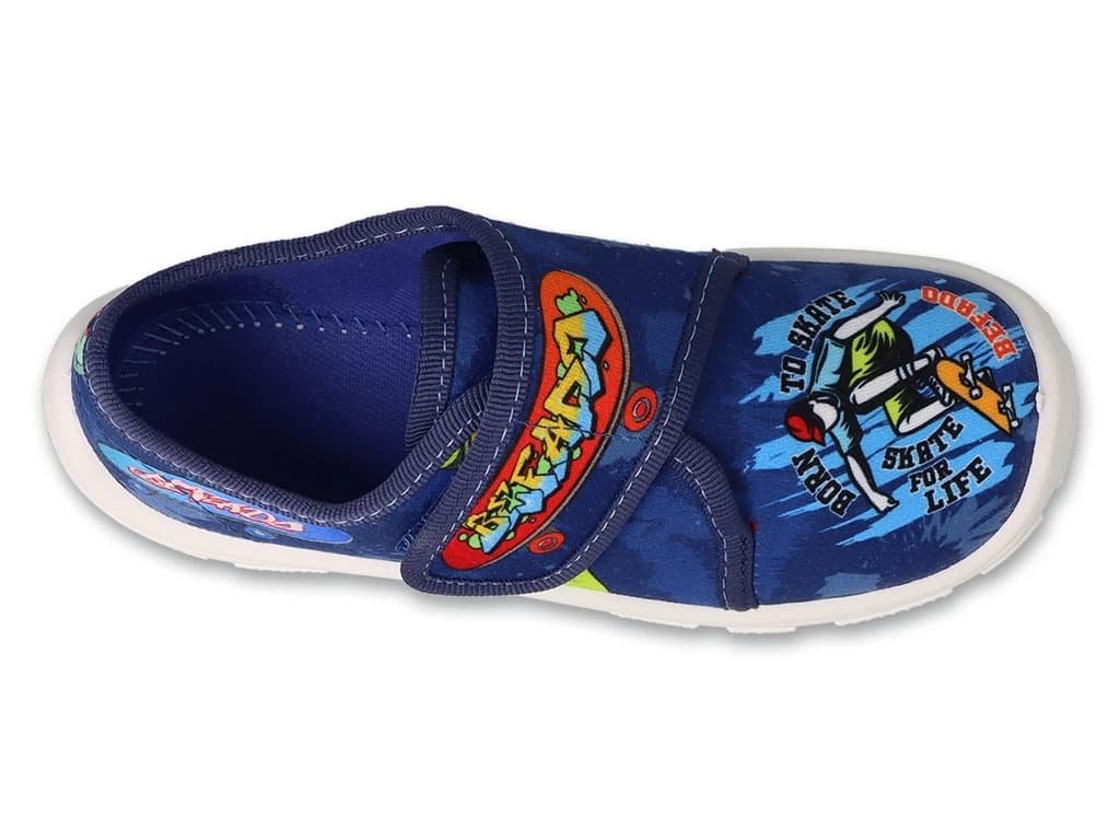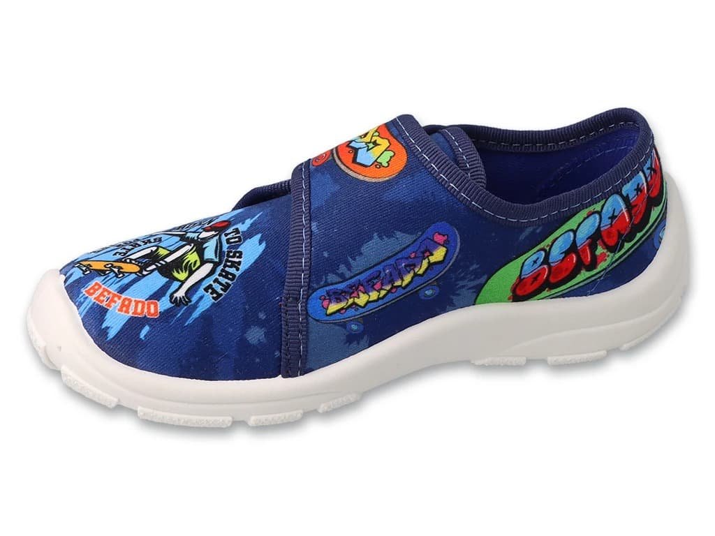Štýlové chlapčenské papuče Befado 974X539 974Y539 s motívom skate . Papuče sú veľmi ohybné , majú z pevnený opätok a nevynímateľnú vnútornú stielku. Podrážka je v bielej farbe s hrubším vzorom a ventilačnými otvormi pre lepšiu priedušnosť. Papuče nezanechávajú šmuhy na podlahe, sú teda vhodné do školy aj škôlky. V prednej aj zadnej časti je podrážka vyvýšená a chráni tak proti okopu. Svojou šírkou sú vhodné na užšiu nohu . Vďaka suchému zipsu sa dajú prispôsobiť v oblasti priehlavku.
