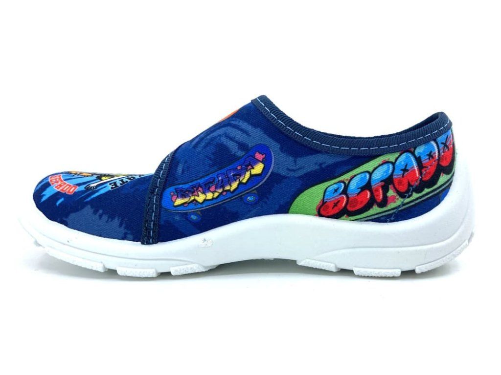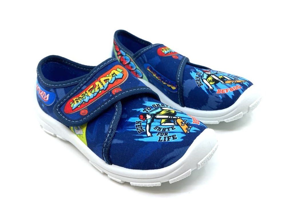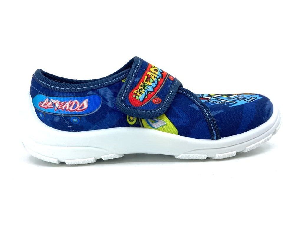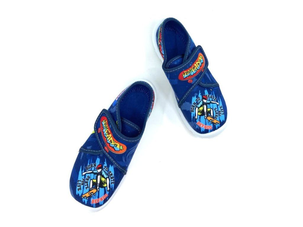 Štýlové chlapčenské papuče Befado 974X539 974Y539 s motívom skate . Papuče sú veľmi ohybné , majú z pevnený opätok a nevynímateľnú vnútornú stielku. Podrážka je v bielej farbe s hrubším vzorom a ventilačnými otvormi pre lepšiu priedušnosť. Papuče nezanechávajú šmuhy na podlahe, sú teda vhodné do školy aj škôlky. V prednej aj zadnej časti je podrážka vyvýšená a chráni tak proti okopu. Svojou šírkou sú vhodné na užšiu nohu . Vďaka suchému zipsu sa dajú prispôsobiť v oblasti priehlavku.