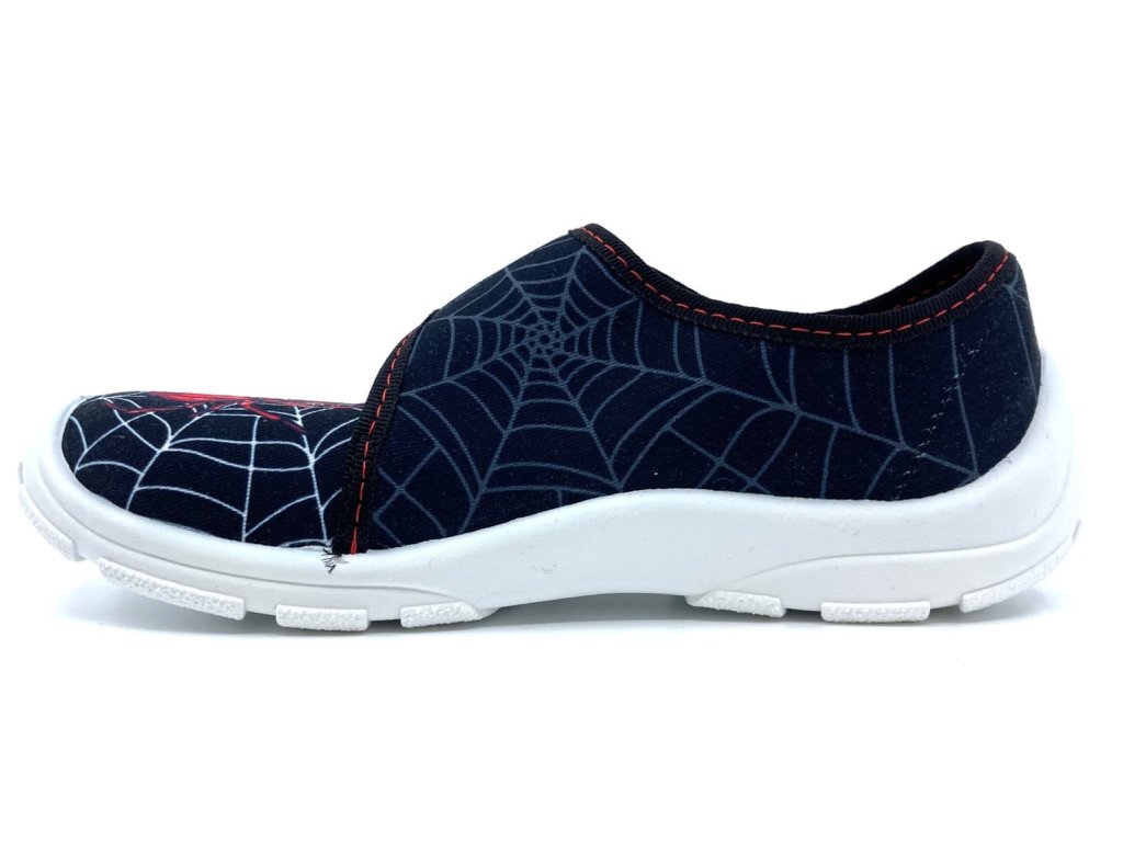 Štýlové chlapčenské papuče Befado 974y565 v čiernej farbe s motívom Spidermana . Papuče sú veľmi ohybné , majú z pevnený opätok a nevynímateľnú vnútornú stielku. Podrážka je v bielej farbe s hrubším vzorom a ventilačnými otvormi pre lepšiu priedušnosť. Papuče nezanechávajú šmuhy na podlahe, sú teda vhodné do školy aj škôlky. V prednej aj zadnej časti je podrážka vyvýšená a chráni tak proti okopu. Svojou šírkou sú vhodné na užšiu a normálne širokú nohu . Vďaka suchému zipsu sa dajú prispôsobiť v oblasti priehlavku.