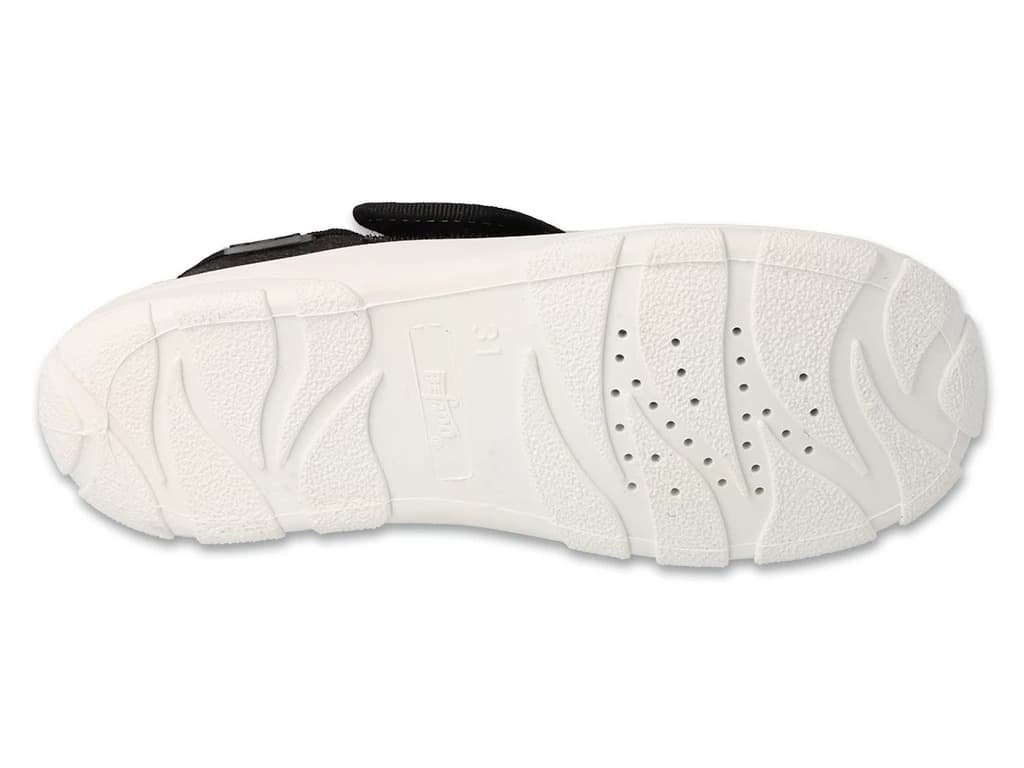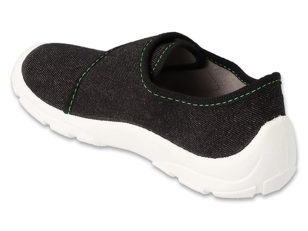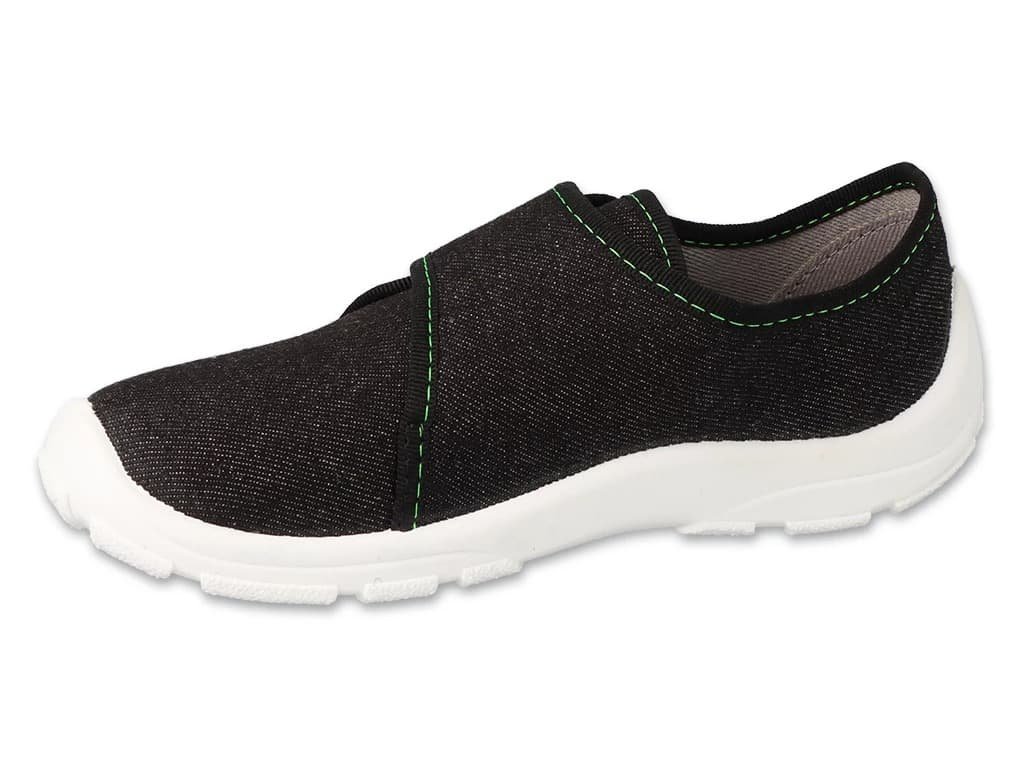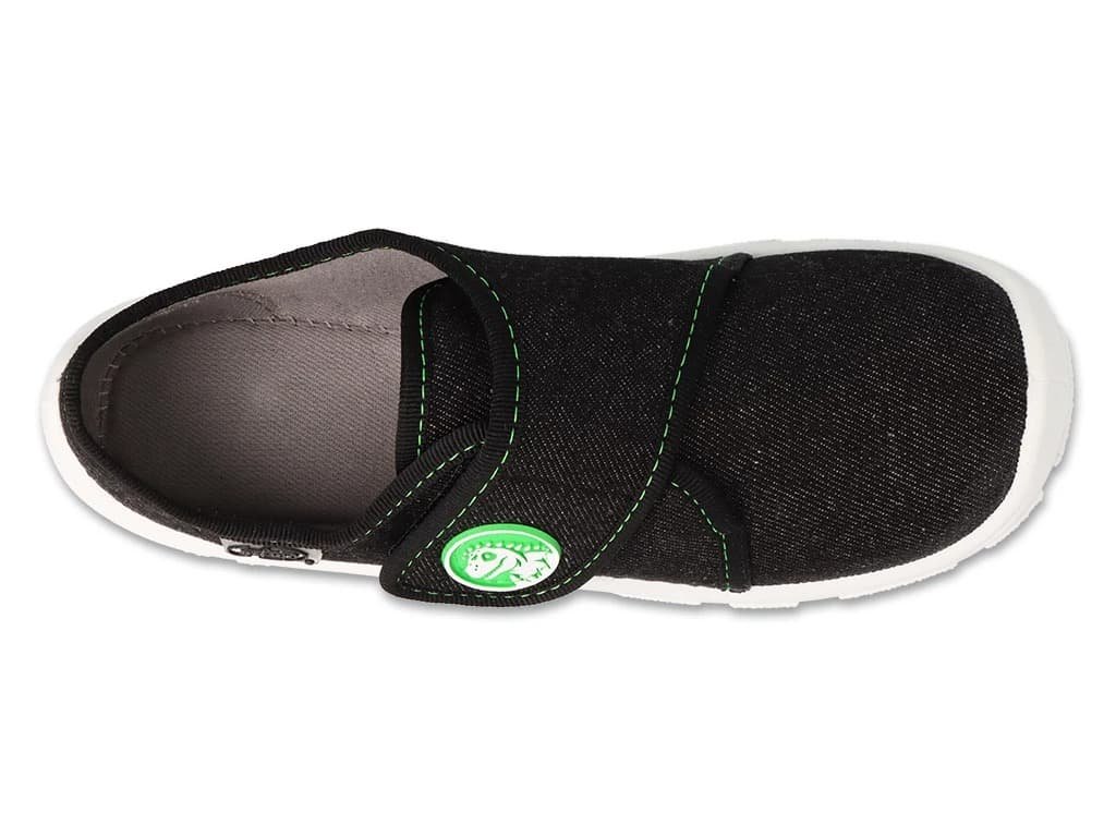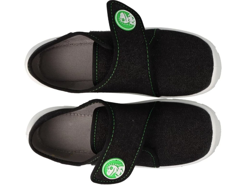 Štýlové chlapčenské papuče Befado 974Y586 Dino v čiernej farbe so zelenými detailmi a dinosaurom . Papuče sú veľmi ohybné , majú z pevnený opätok a nevynímateľnú vnútornú stielku. Podrážka je v bielej farbe s hrubším vzorom a ventilačnými otvormi pre lepšiu priedušnosť. Papuče nezanechávajú šmuhy na podlahe, sú teda vhodné do školy aj škôlky. V prednej aj zadnej časti je podrážka vyvýšená a chráni tak proti okopu. Svojou šírkou sú vhodné na užšiu a normálne širokú nohu . Vďaka suchému zipsu sa dajú prispôsobiť v oblasti priehlavku.