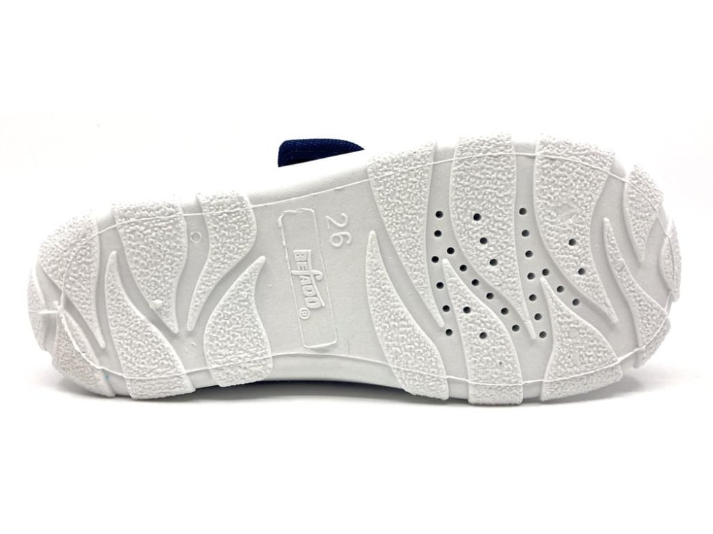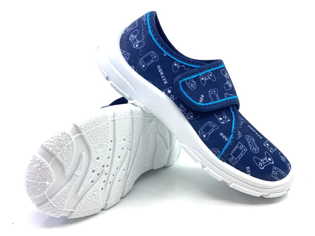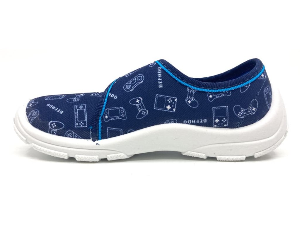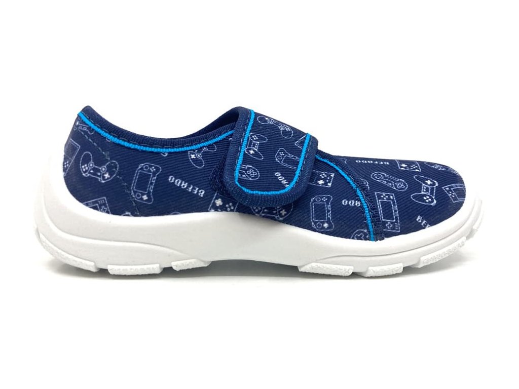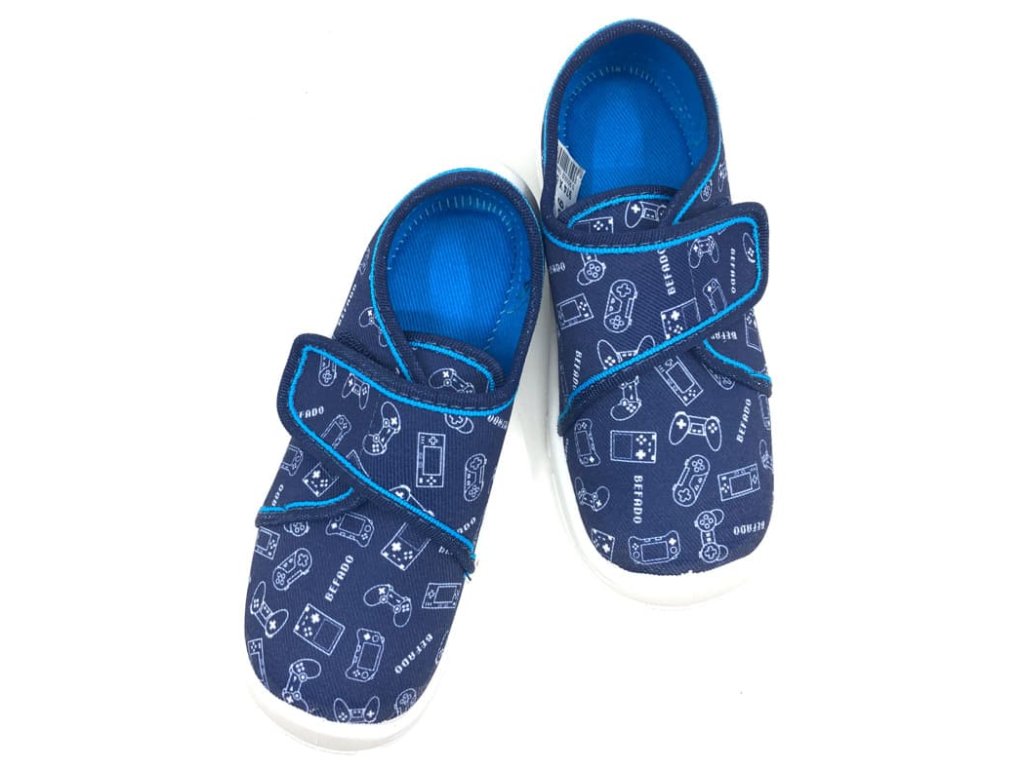 Štýlové chlapčenské papuče Befado Game 974x520 v modrej farbe. Papuče sú veľmi ohybné, majú spevnený opätok a nevynímateľnú vnútornú stielku. Podrážka je v bielej farbe s hrubším vzorom a ventilačnými otvormi pre lepšiu priedušnosť. Papuče nezanechávajú šmuhy na podlahe, sú teda vhodné do školy aj škôlky. V prednej aj zadnej časti je podrážka vyvýšená a chráni tak proti okopu. Svojou šírkou sú vhodné na užšiu nohu. Vďaka suchému zipsu sa dajú prispôsobiť v oblasti priehlavku.