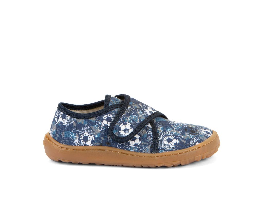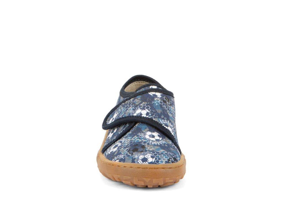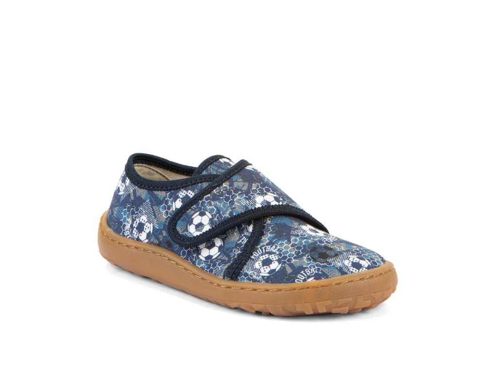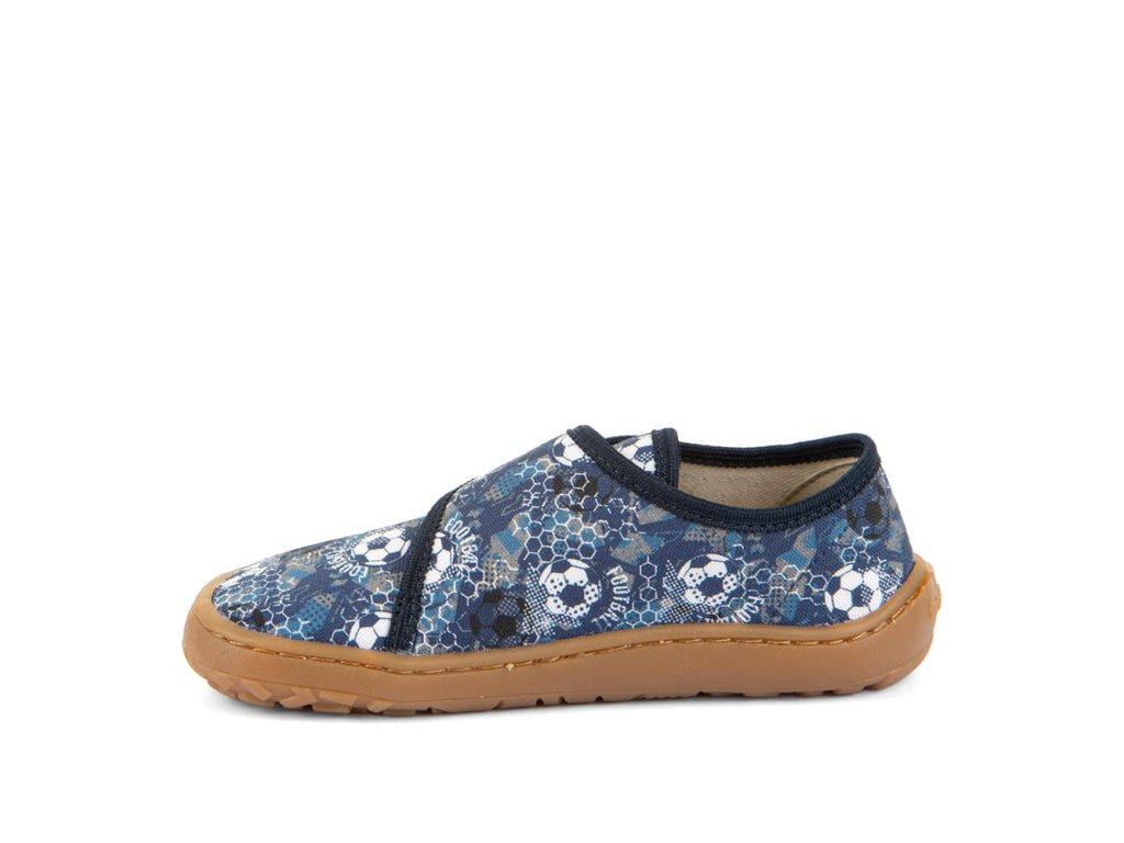 Papuče Froddo Slippers G1700438-6 Blue s futbalovým motívom sú barefoot papuče vhodné na doma alebo do školy či škôlky, ale použiteľné aj na behanie vonku pri teplom počasí. Sadnú deťom s úzkou nohou a normálnym až ľahko vyšším priehlavkom. Podrážka je ohybná všetkými smermi, gumová.