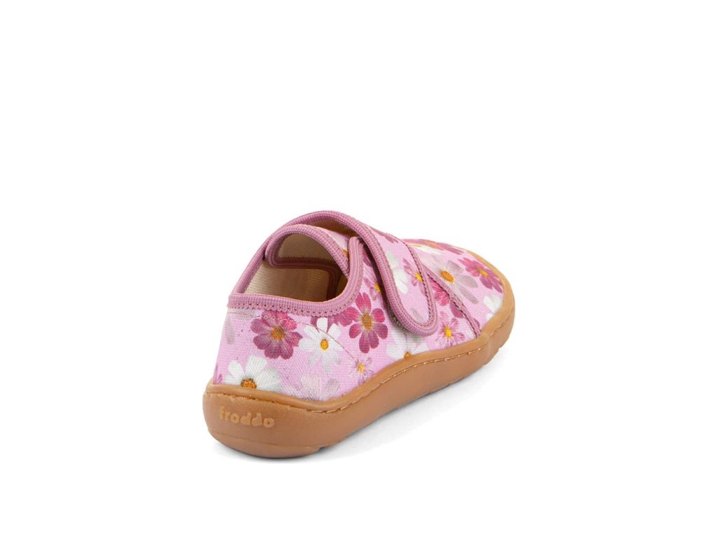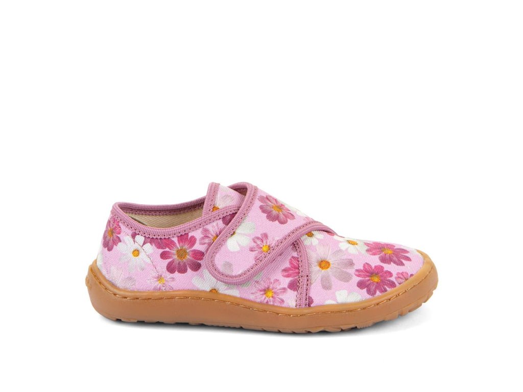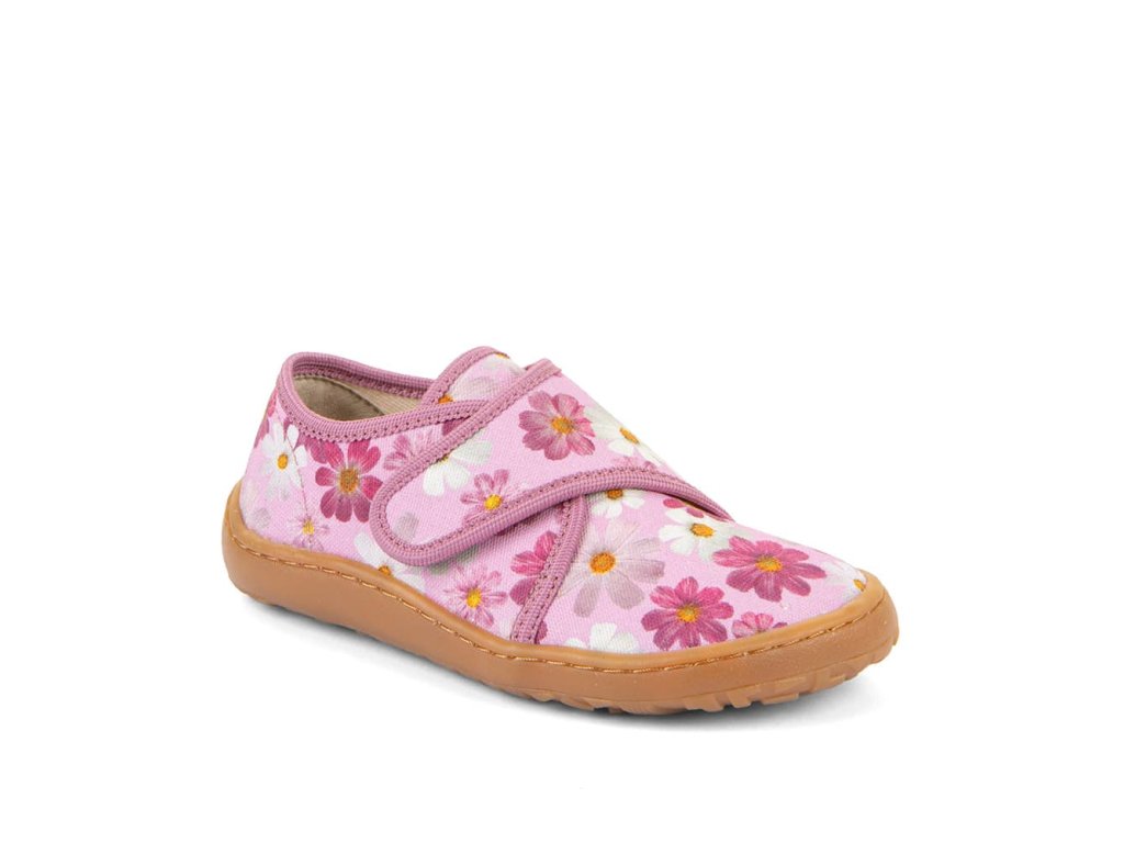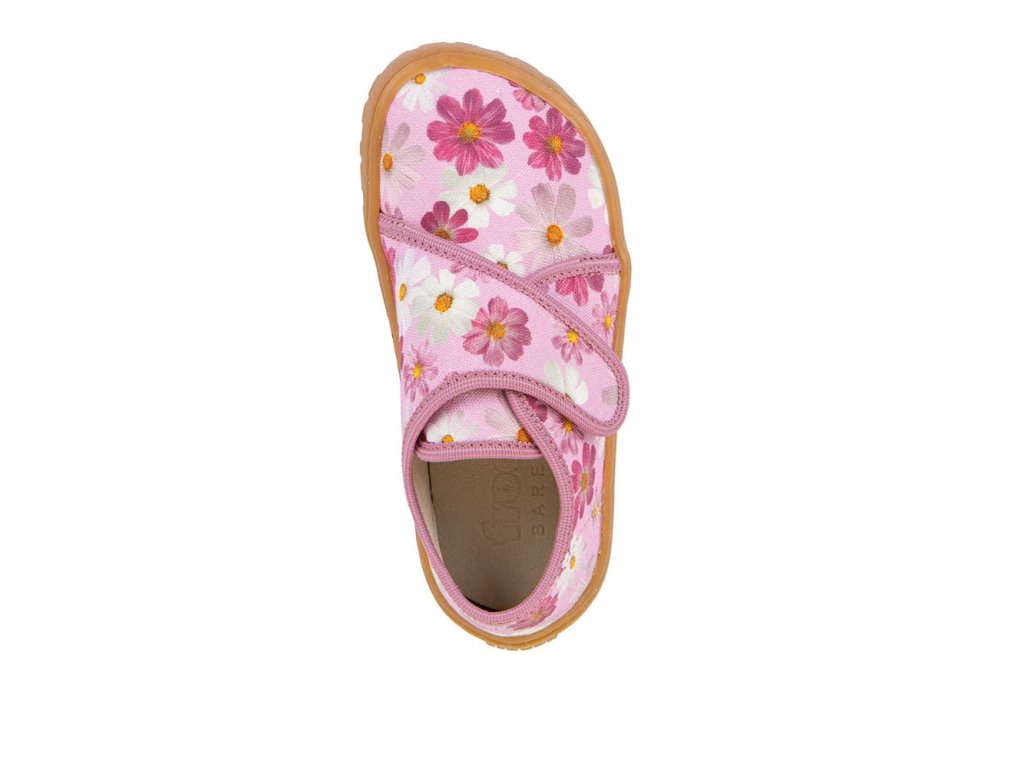 Papuče Froddo Slippers G1700438-8 Flowers s kvietkami sú barefoot papuče vhodné na doma alebo do školy či škôlky, ale použiteľné aj na behanie vonku pri teplom počasí. Sadnú deťom s úzkou nohou a normálnym až ľahko vyšším priehlavkom. Podrážka je ohybná všetkými smermi, gumová.