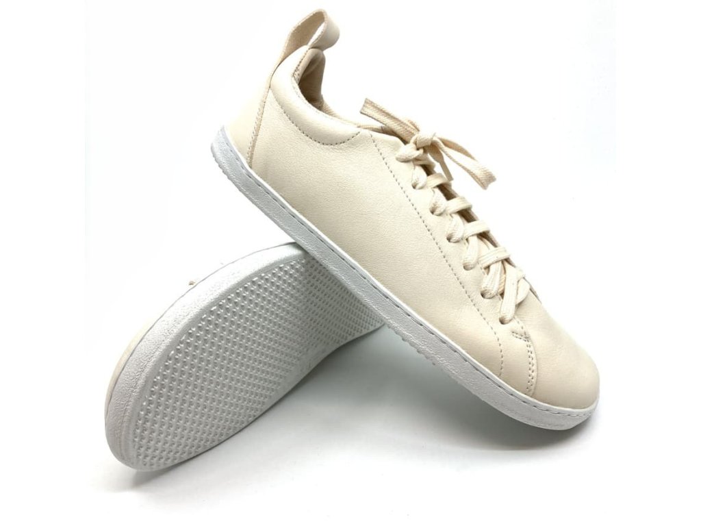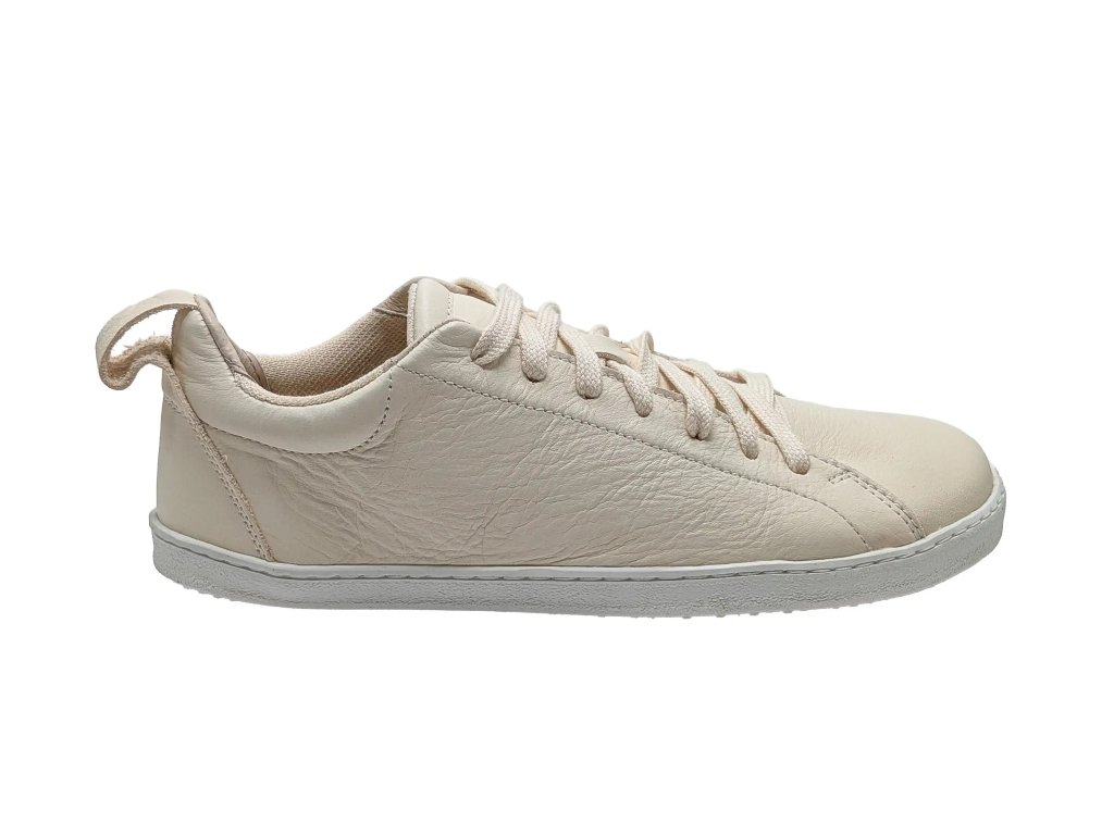 Kožené barefoot tenisky Pegres BF84 prírodná biela v bielej farbe so zvrškom z hladkej kože , šité na barefoot kopytoch s anatomickým tvarom špičky, vhodným aj pre dominantné palce.