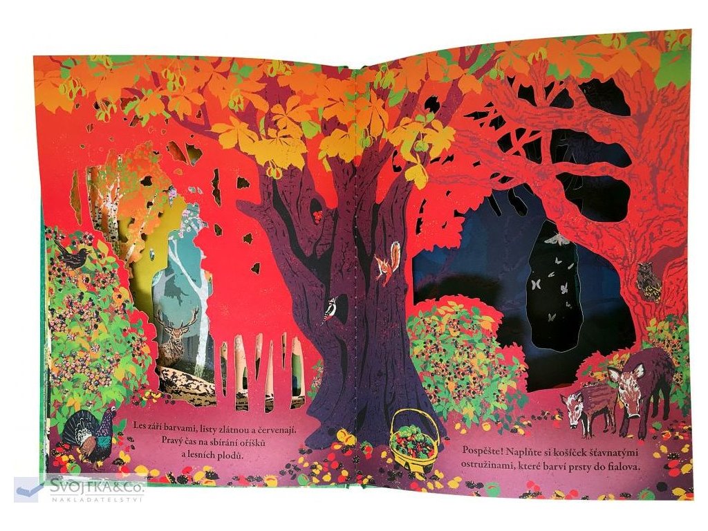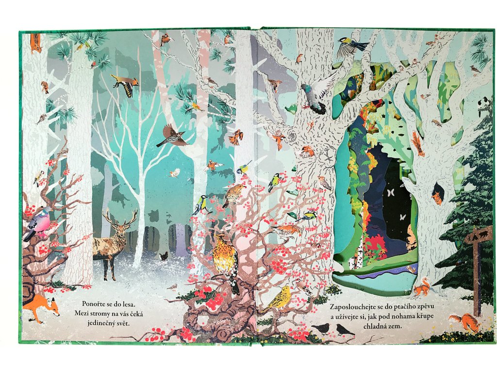 Les je tichý, pokojný, hlboký a nemenný... Ale skrýva sa v ňom aj plno života! Najmä, keď sa mení ročné obdobie, premieňa svoju tvár aj les. Ponorte sa doň v tejto úchvatnej knižke s priehľadovými výrezmi. Objavujte nádherné detaily v scenériách, ktoré sa pred vami postupne odkrývajú. Koloušek hľadá svoju mamičku, veveričky zháňajú plody a oriešky na zimu, bobry stavajú hrádzu a spod lístia vykukujú klobúky húb. Medzi tým všetkým ste vy ako nenápadní pozorovatelia nikdy nekončiaceho lesného dobrodružstva. Počas večerov sa môžete ohriať pri táboráku av zime spočinúť v zrube. Ale príliš neotáľajte; v lese je toho stále veľa na objavovanie!