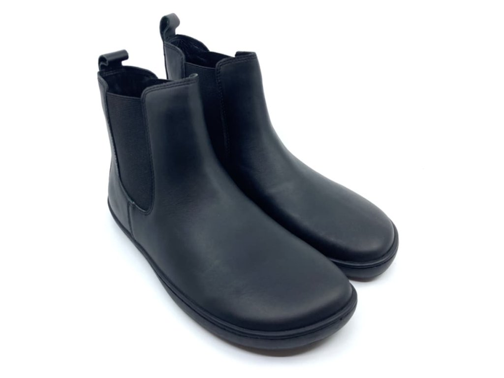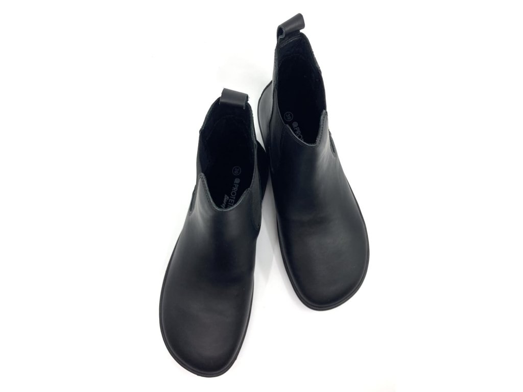 Dámske zimné barefoot poločižmy alebo topánky typu chelsea Protetika Debora Dark Black v čiernej farbe majú zvršok z hladkej kože, podšívku a stielku z textilu s miernym chĺpkom. Po stranách členku je silná guma, pre ľahké obúvanie.
