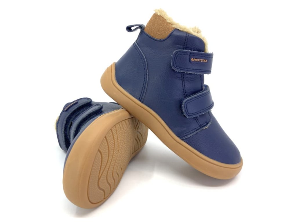 Detské barefoot zimné topánky Protetika Deny Navy 2023 končí tesne nad členkom, na novej podrážke na rok 2023, ktorá je priestrannejšia v špičke ako starší typ podrážky. Topánky sú zvonku z hladkej kože v tmavo modrej farbe s béžovou podrážkou. Vnútri topánky je príjemný nehryzový kožúšok, vyberateľná stielka má filcovú vrchnú vrstvu. Jazyk je prišitý iba v dolnej časti a tak sa dajú topánky veľa otvoriť a pohodlne obuť.