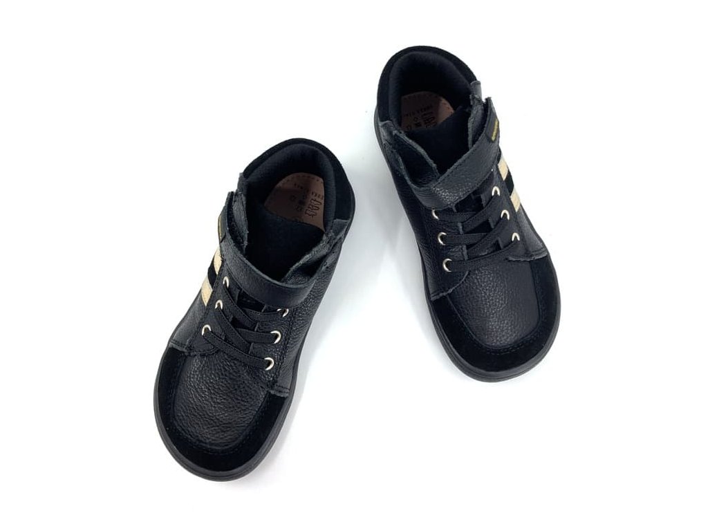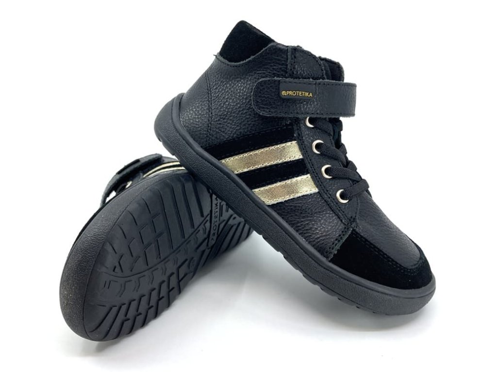 Protetika Gerka Black sú dievčenské barefoot celoročné topánky z obľúbenej hladkej kože v kombinácii s velúrom. Topánky majú priestrannú špičku (oproti modelu 2023 sú cca o 2mm užšie v prstoch), viac miesta pre palec (aj dominantné), sadnú na normálne široké nôžky. Nový model má mäkkú podrážku, výborne ohybnú všetkými smermi (mäkšie ako mali modely 2023).