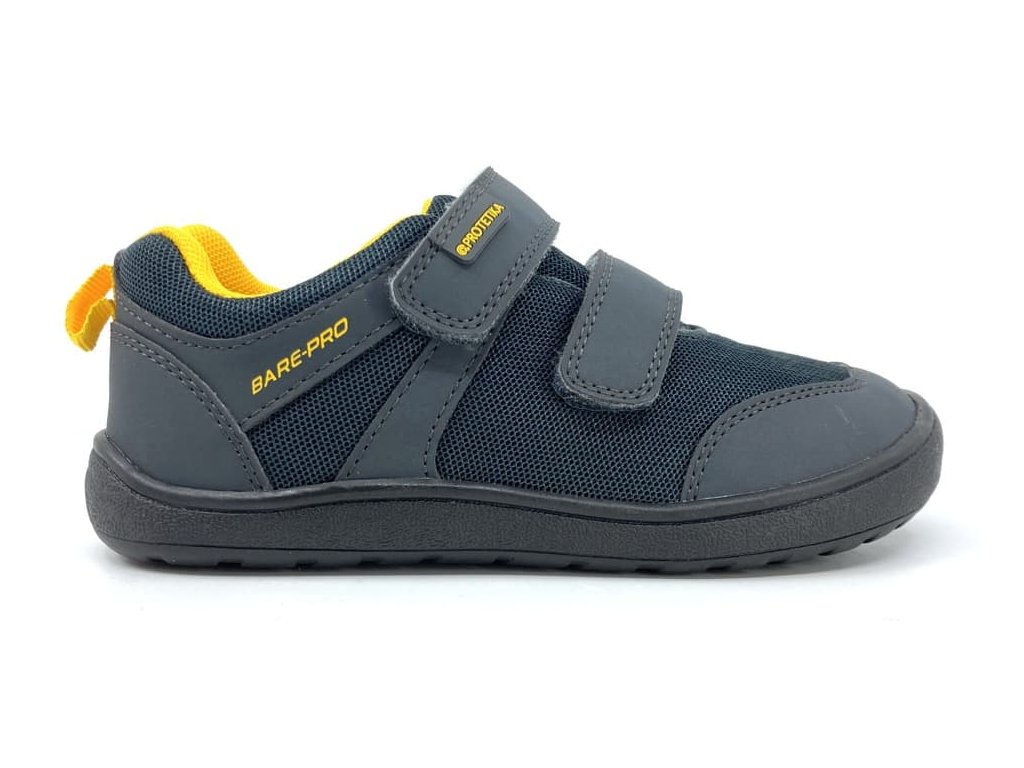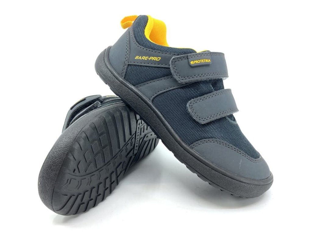 Protetika Nolan Yelllow v šedej farbe so žltými detailmi. Sú priedušné barefoot tenisky vhodné do teplých dní. Zvršok topánky je textilný v kombinácii so syntetikou, podšívka je textilná s vyberateľnou stielkou z kože. Zosilnený materiál na špičke chráni topánku proti okopaniu.