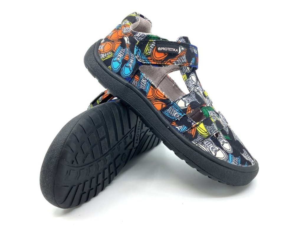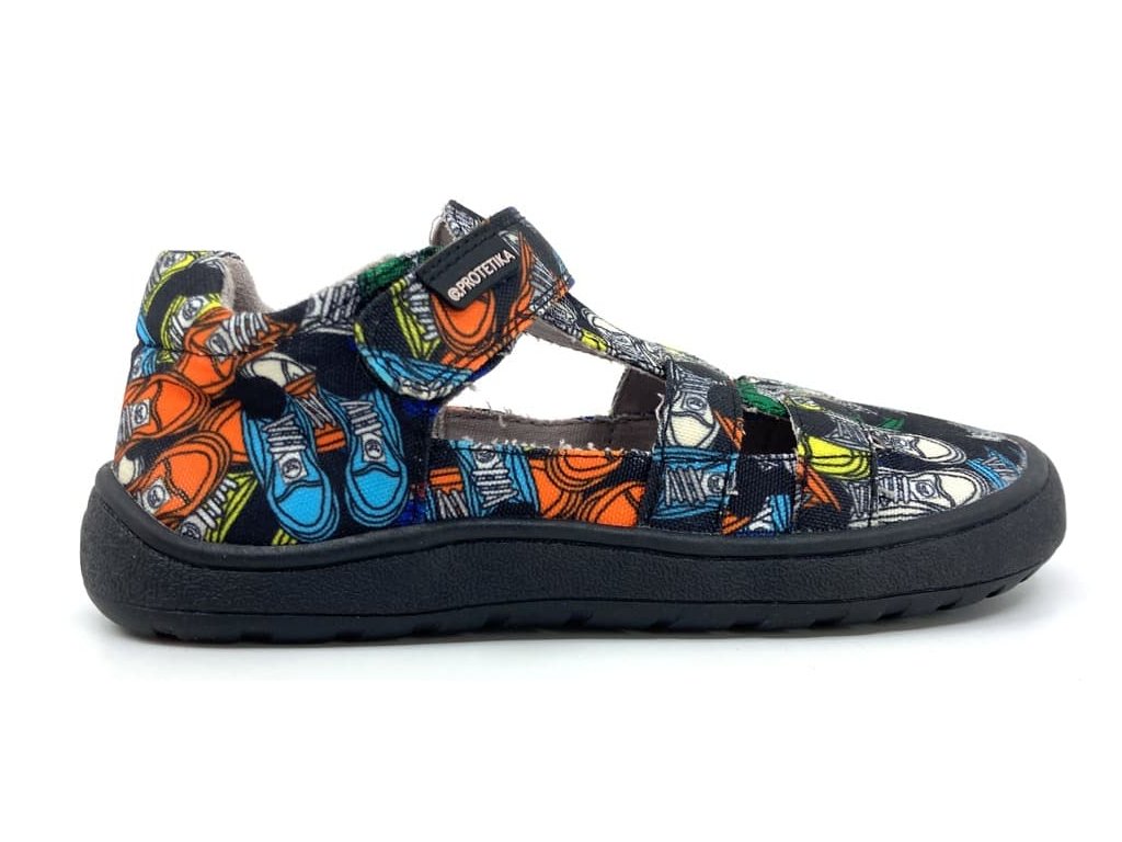 Protetika Ove Black sú chlapčenské barefoot papuče vhodné na doma alebo do školy či škôlky , ale použiteľné aj na behanie vonku pri teplom počasí. Model Ove je kompletne textilný as vyberateľnou textilnou stielkou . Podrážka je ohybná a gumová.