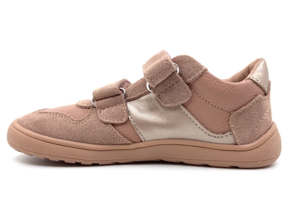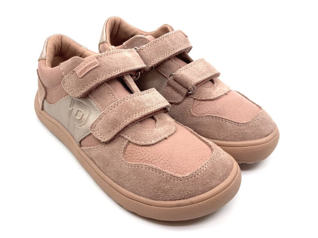 Protetika Perla Pink v ružovej farbe sú dievčenské celoročné barefoot topánky. Zvršok tvorí kombinácia hladkej a brúsenej kože , podšívka aj stielka sú taktiež kožené . Topánky sadnú na normálne široké nôžky . Špička je dostatočne priestranná a vhodná pre dominantné palce. Podrážka je mäkká a ohybná.
