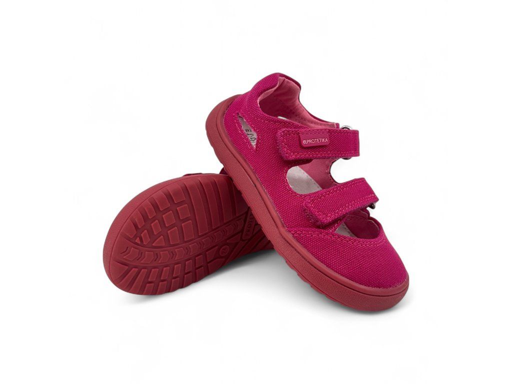 Textilné barefoot sandálky Protetika Tafi Fuxia vo výraznej ružovej farbe sú skvelé na každodenné nosenie počas celého leta. Topánky sú mäkké a ohybné . Sadnú na priemerne široké nôžky s dominantným palcom .