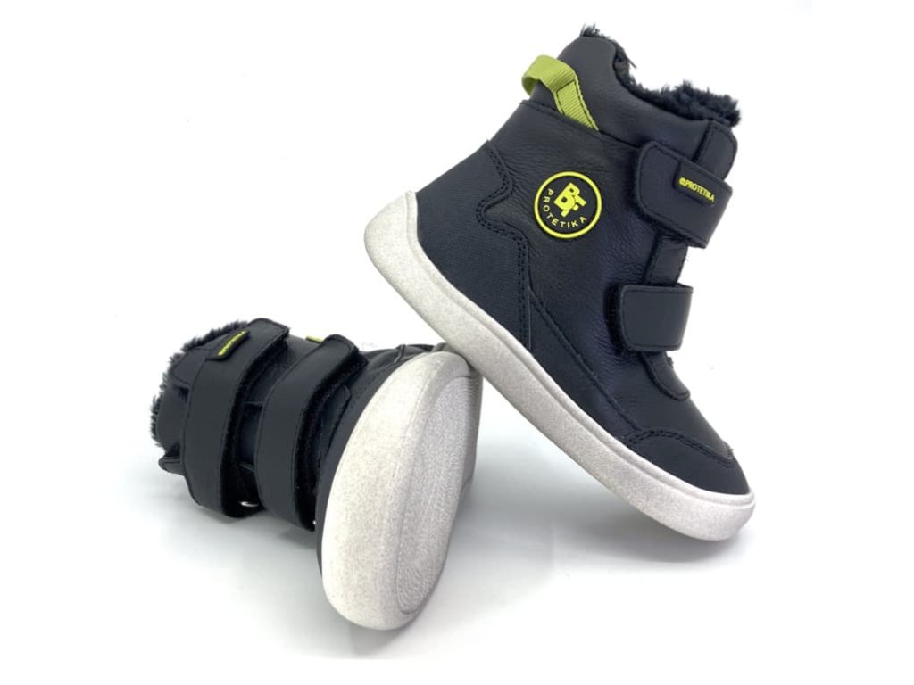 Detské barefoot zimné topánky Protetika Tarik Nero 2023 končí nad členkom, na novej podrážke na rok 2023, ktorá je priestrannejšia v špičke ako starší typ podrážky. Topánky sú zvonku z hladkej kože v čiernej farbe so šedou podrážkou. Ochrana proti okopu. Vnútri topánky je príjemný nehryzový kožúšok, vyberateľná stielka má filcovú vrchnú vrstvu. Jazyk je prišitý iba v dolnej časti a tak sa dajú topánky veľa otvoriť a pohodlne obuť.