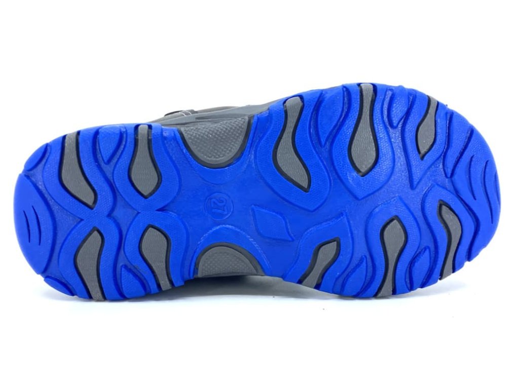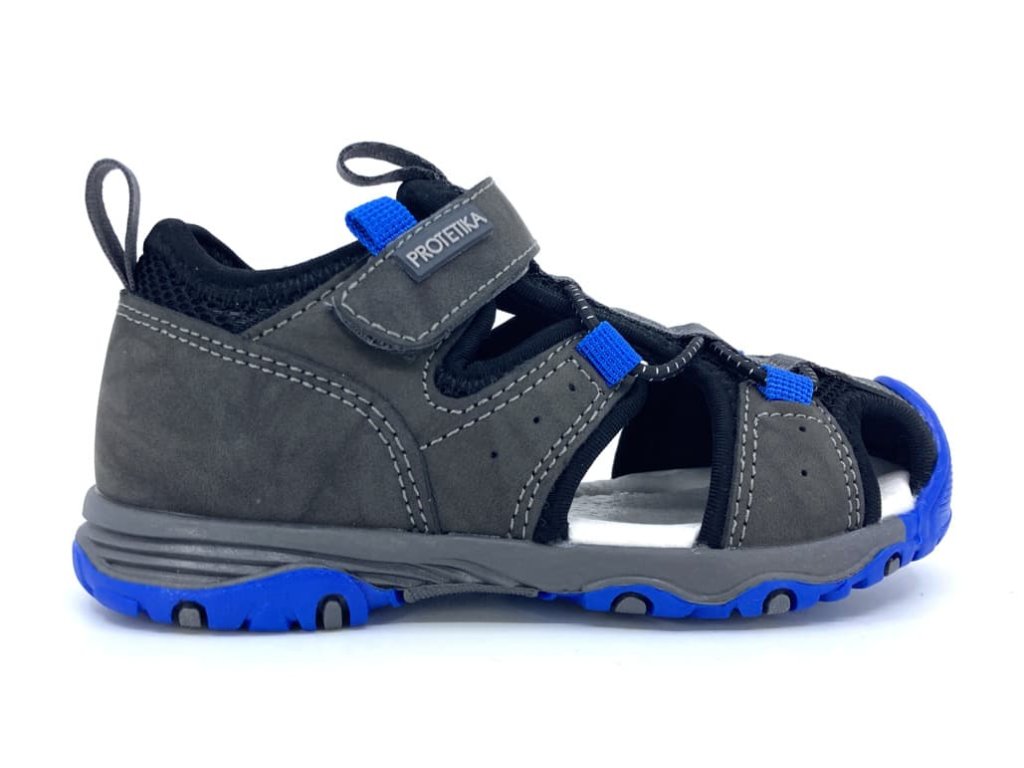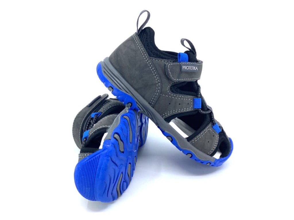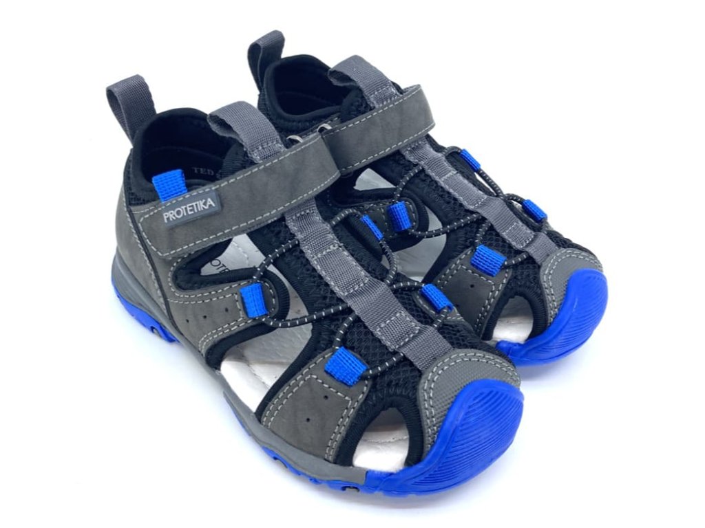 Protetika Ted Grey v šedo-čiernej kombinácii s modrými prvkami sú letné sandále v športovom štýle skvelé na bežné nosenie do mesta aj šport . Pevná uzavretá päta zabraňuje "šmajdaniu", prekryté prsty sú perfektné na detské lietanie vonku.