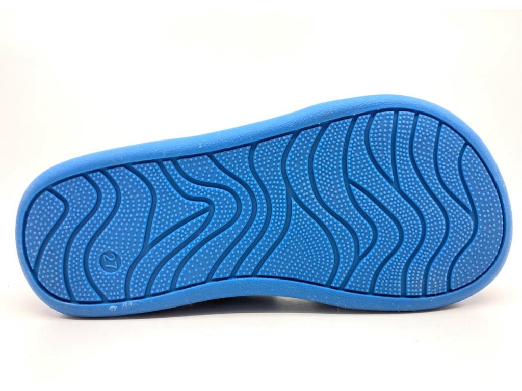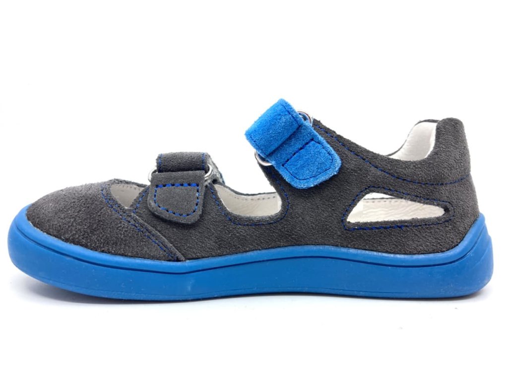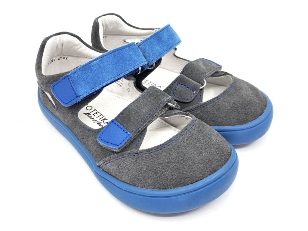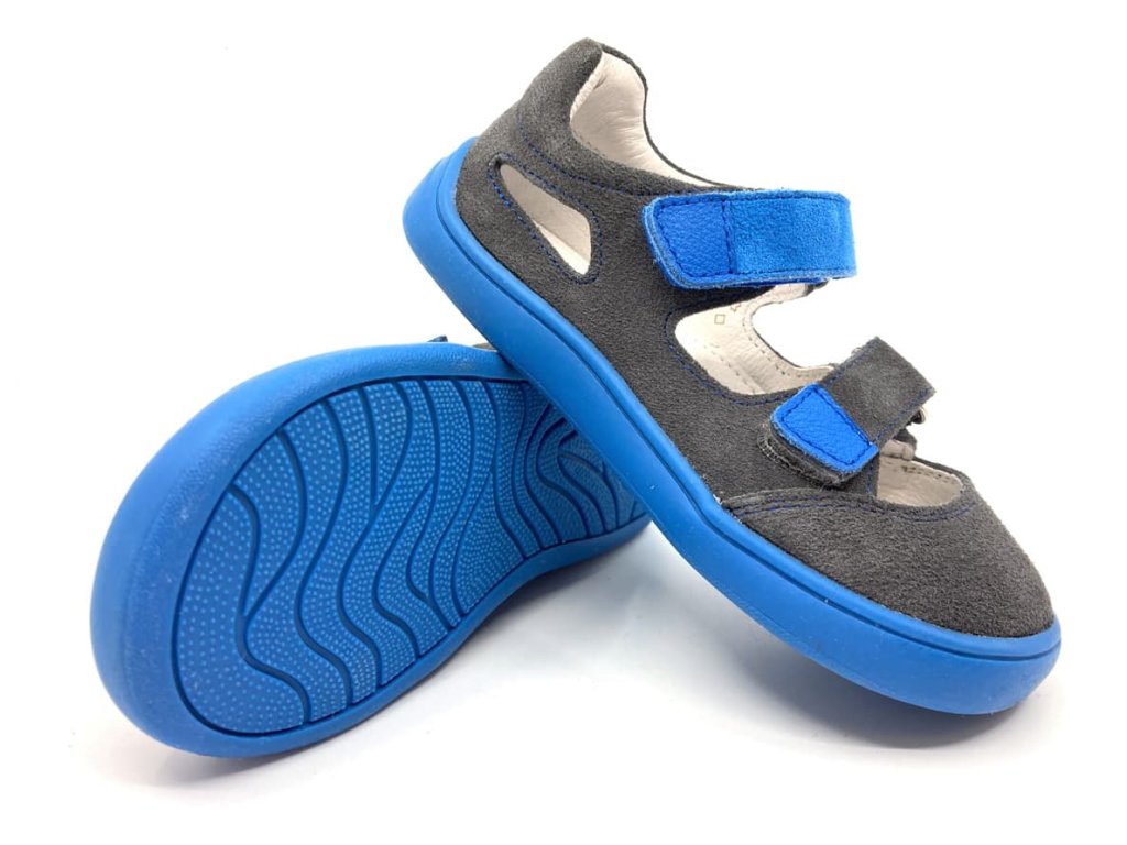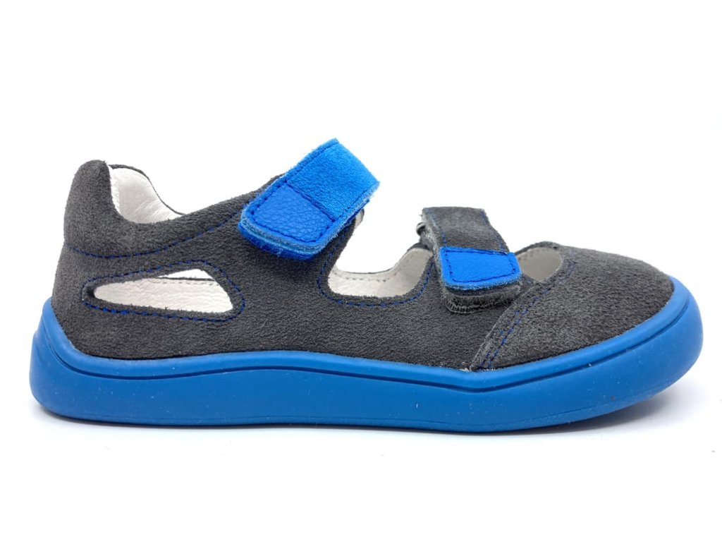 Zvršok je zo šedého velúru (brúsenej kože), jeden velcro opasok je modrý ladiaci s modrou podrážkou.
