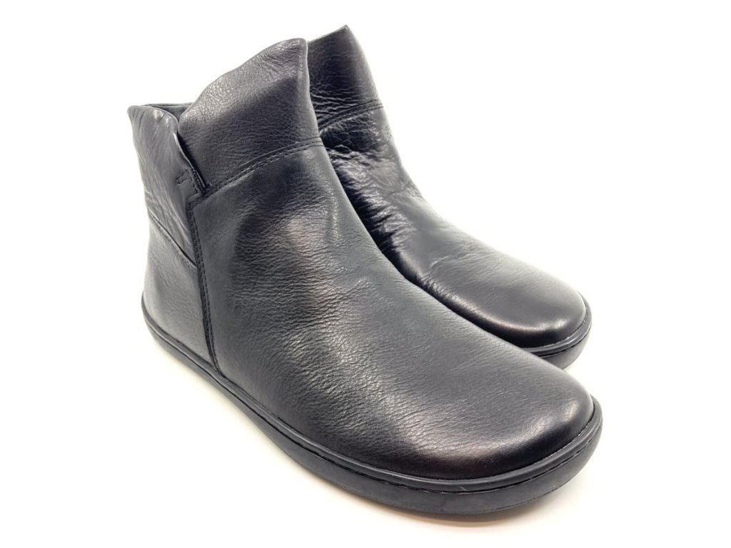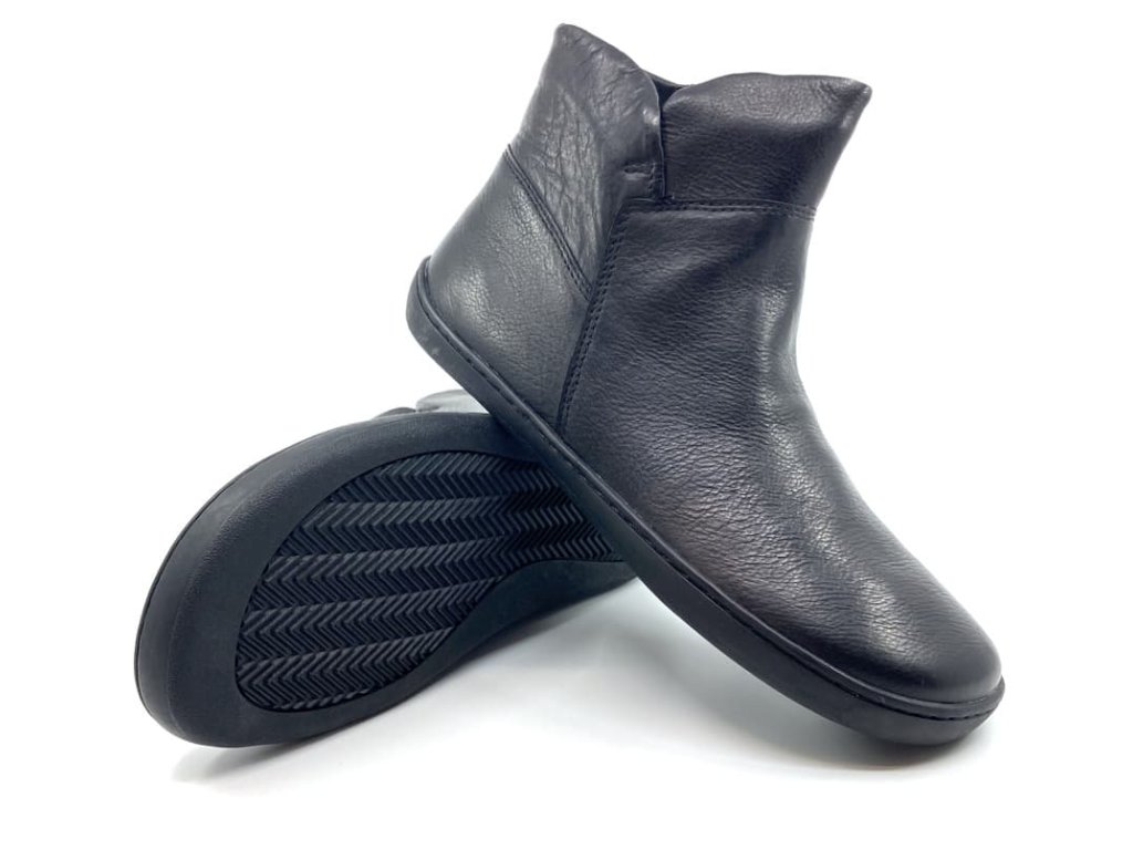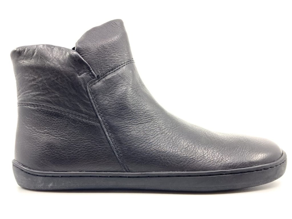 Dámske zimné barefoot poločižmy čiže topánky typu chelsea Protetika Debora Dark Black v čiernej farbe majú zvršok z hladkej kože , podšívku a stielku z textilu s miernym chĺpkom. Po stranách členku je silná guma, pre ľahké obúvanie. Oproti modelu Debora Dark Black majú zapínanie na zips z jednej strany, idú tak dobre utiahnuť v členku.