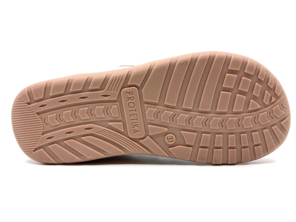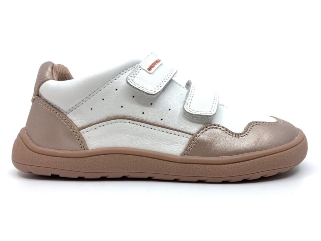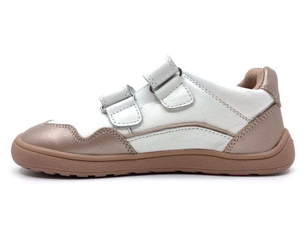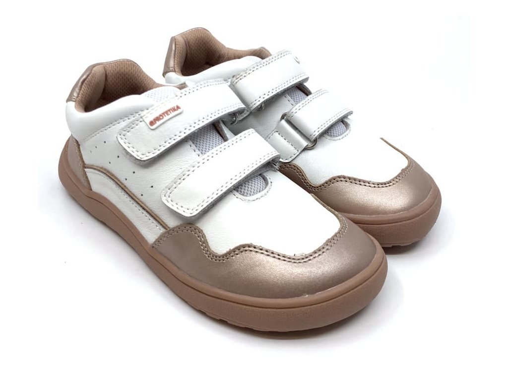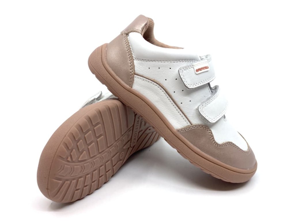 Protetika Ventra White v ružovo-bielej kombinácii sú dievčenské celoročné barefoot topánky . Zvršok je z hladkej kože s textilným jazykom, podšívka z mäkkej priedušnej textílie. Stielka má nášľapnú vrstvu z príjemnej kože . Na vonkajšej strane sú tenisky perforované pre ešte lepšiu priedušnosť.