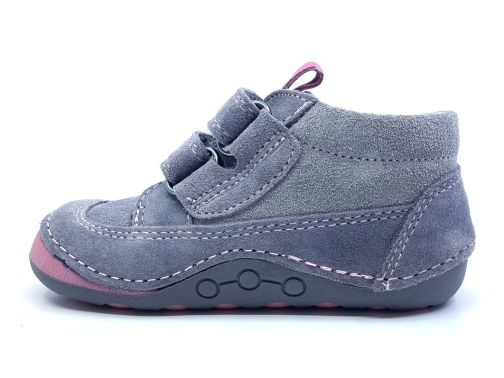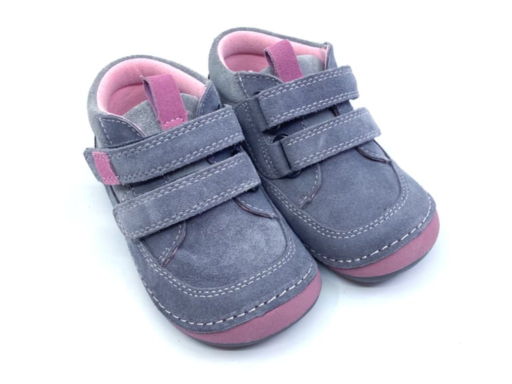 Barefoot topánky Protetika Zana v šedej farbe seružovými detailmi na podrážke. Zana padnú na veľmi širokú nohu a sú vhodné aj pre vyšší priehlavok - sadnú aj na veľmi bucľaté a široké nôžky, na ktoré je ťažké "zohnať" padnúcu topánku.