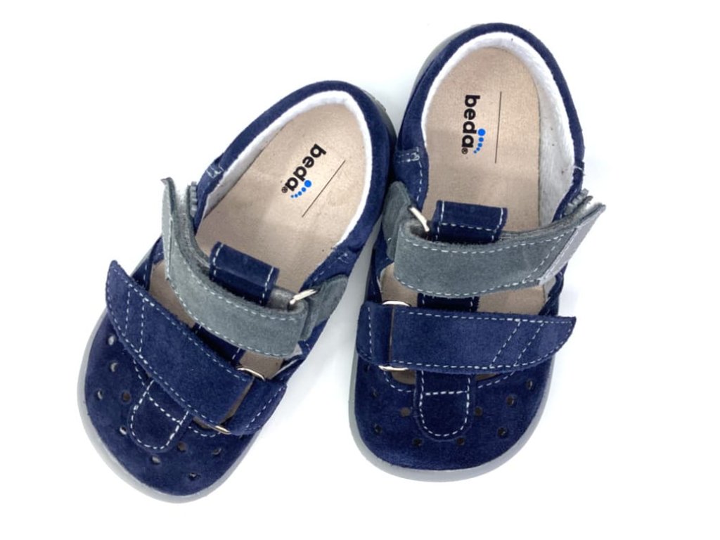 Kožené detské 100% barefoot sandále Beda Lucas v tmavo modrej farbe so šedou podrážkou. Pohodlný širší strih rešpektujúci tvar nohy - priestranná špička, mäkučké, ľahučké, ohybné. Reflexný prvok na velcro pásku pre dobrú viditeľnosť a bezpečnosť vášho dieťaťa. Prekrytá špička na ochranu prstov, ale zároveň dostatok otvorov na dobré vetranie nôh.