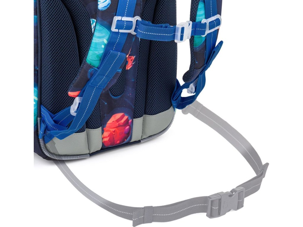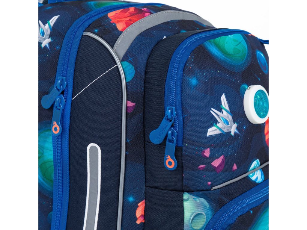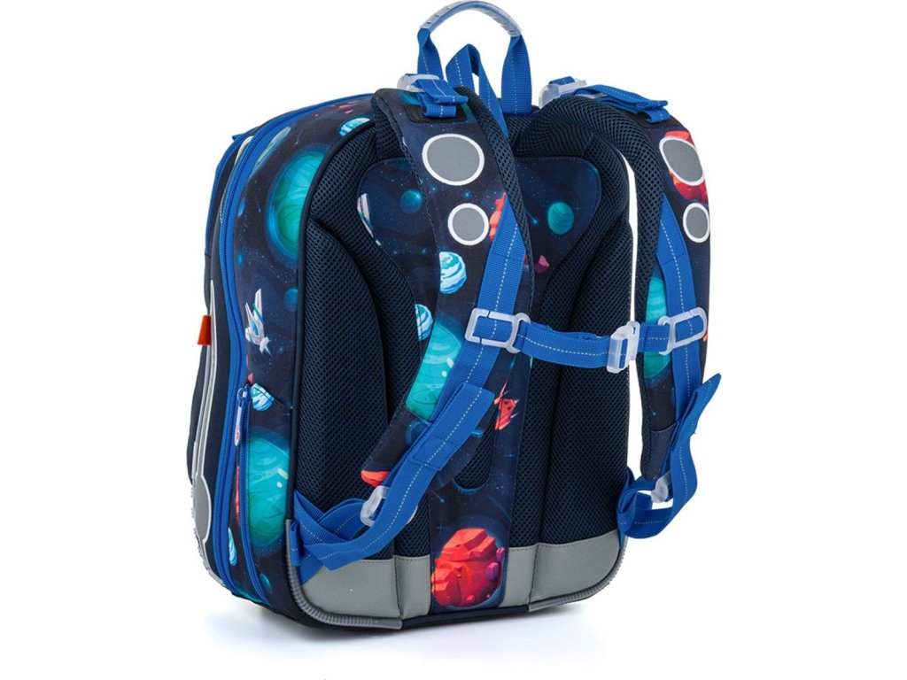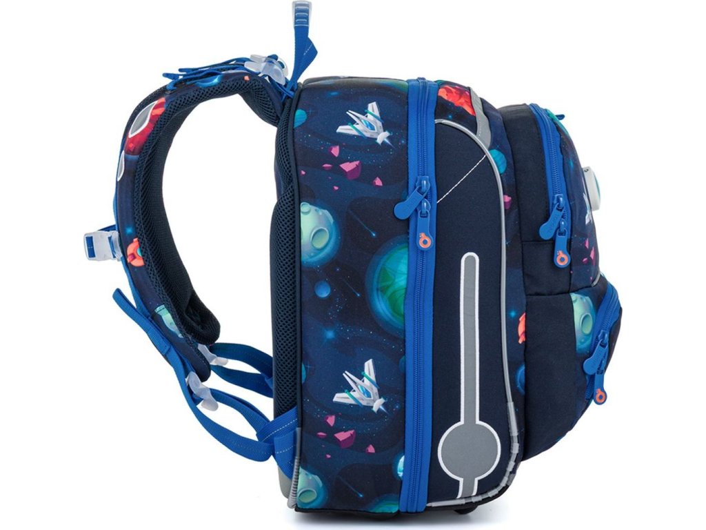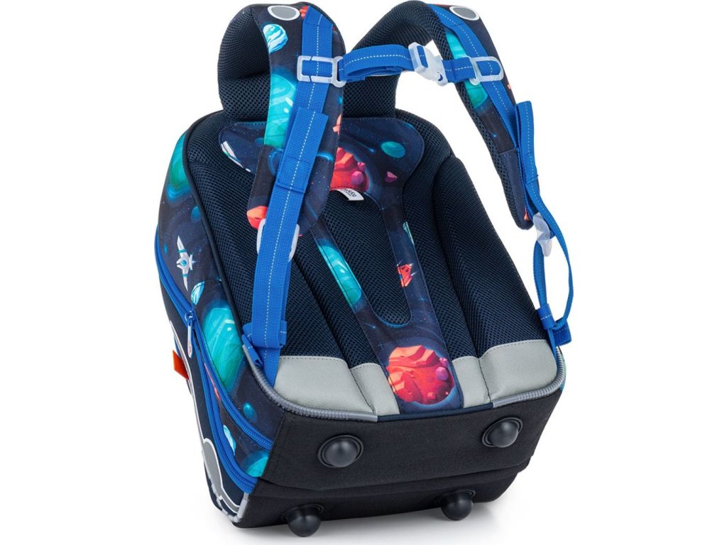 Školská aktovka je navrhnutá s ohľadom na potreby malých školákov - je ľahká, prehľadná a skvele sedí na chrbte. Hravý vesmírny motív plný planét, rakiet a galaxií nadchne všetkých malých objaviteľov, ktorí sa chcú vydať na svoju prvú školskú misiu.