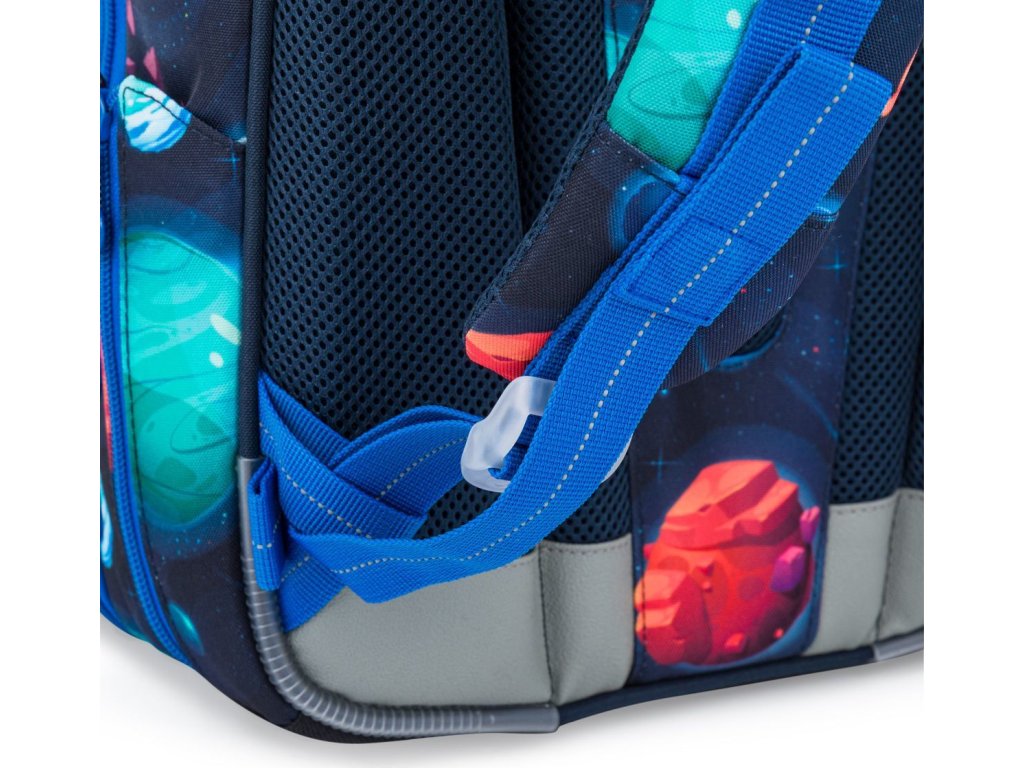 BEBE 26013 je ideálna školská aktovka na prvé školské roky – spája funkčnosť, pohodlie a hravý dizajn inšpirovaný vesmírom.