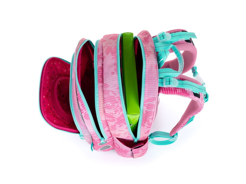 Batoh má dve objemné hlavné komory. Zadná komora je širšia - odporúčame k chrbtu dávať najťažšie učebnice alebo dosky na zošity. Predná komora je o niečo užšia a je v nej umiestnené ešte malé sieťové vrecko na zips a menovka.