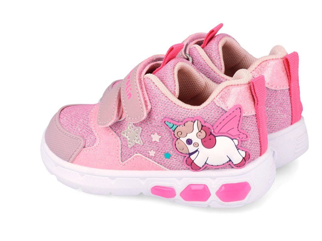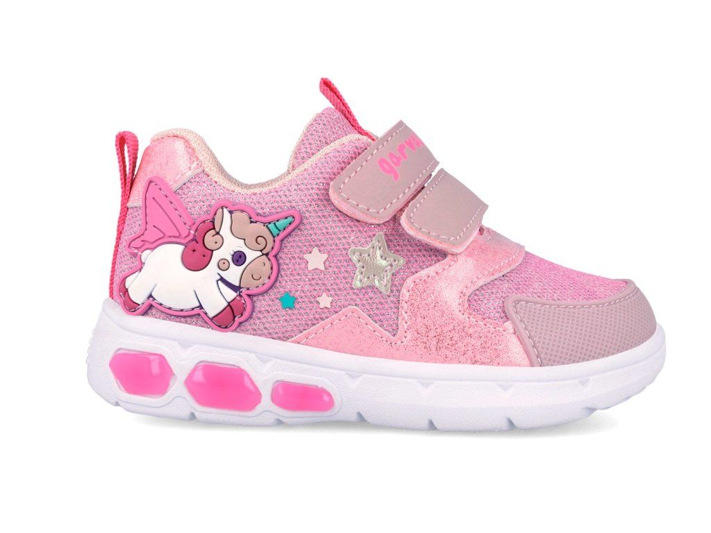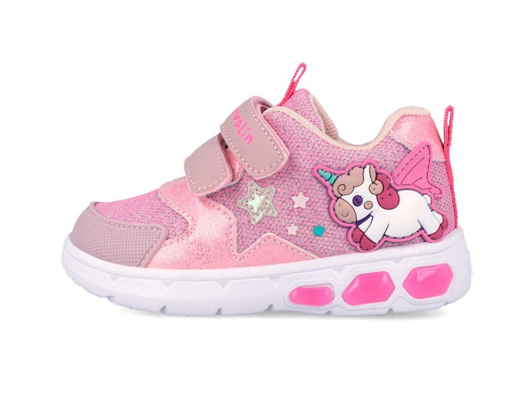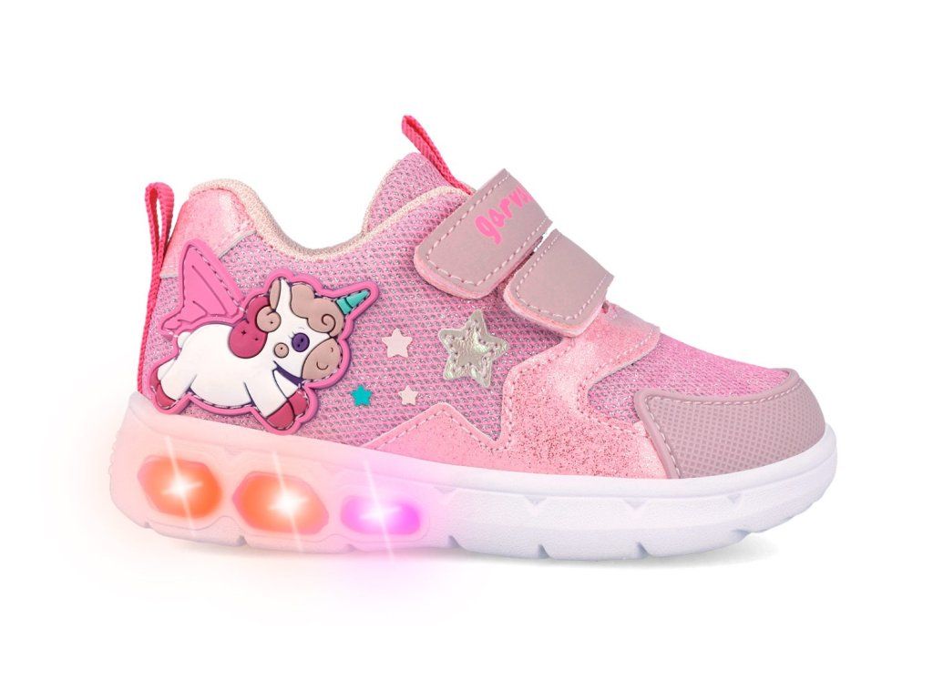 Svietiace tenisky Garvalín 262720 Rosa v dievčenskej trblietavej, ružovej farbe s motívom jednorožca. Podrážka na strane topánky pri chôdzi bliká ! To deti milujú! Blikanie je navyše praktické v tme alebo keď je šero – dieťa je tak dobre vidieť a to je skvelé pre jeho bezpečie.