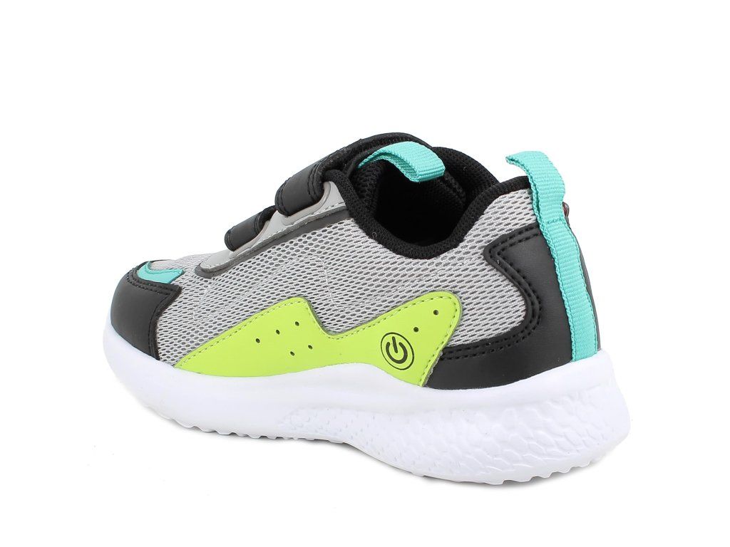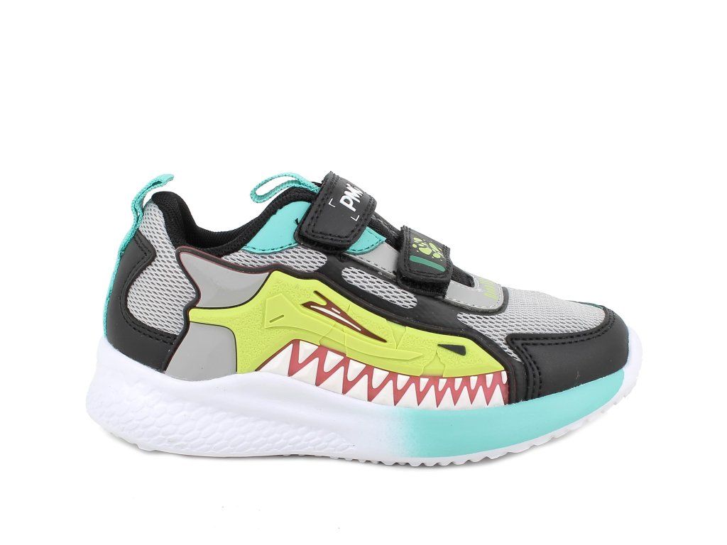 Detské tenisky Primigi 7966711 s blikajúcim dinosaurom na boku, diódy v dinosaurie papuli sa rozblikajú pri došľape . Ako bonus bude Vaše dieťa v tme dobre vidieť a tým sa zvýši jeho bezpečie. Funkciu blikania je možné vypnúť vypínačom na vnútornom boku topánky. Podrážka je veľmi ľahká, a má jemnú vzorku. Vďaka kombinácii textilných a syntetických materiálov sú topánky dobre priedušné a zároveň odolné.