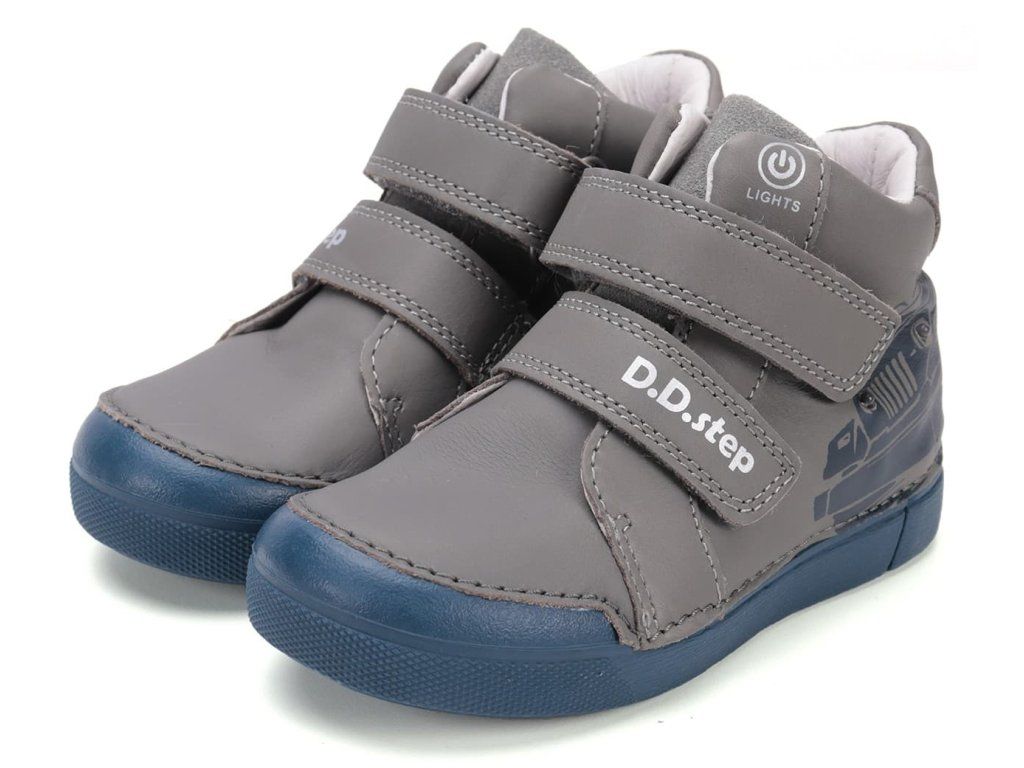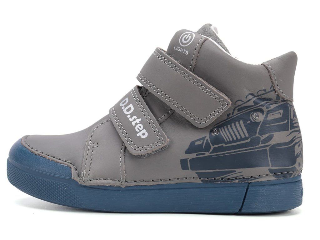 Chlapčenské Svietiace topánky DD Step A068-52151BM šedej farby, s obľúbeným motívom "topánky s autom" pri chôdzi na zvršku zelene svietia a to chlapci doslova milujú! Blikanie je možné vypnúť a opäť zapnúť. Ako bonus bude Vaše dieťa v tme dobre vidieť a tým sa zvýši jeho bezpečie.